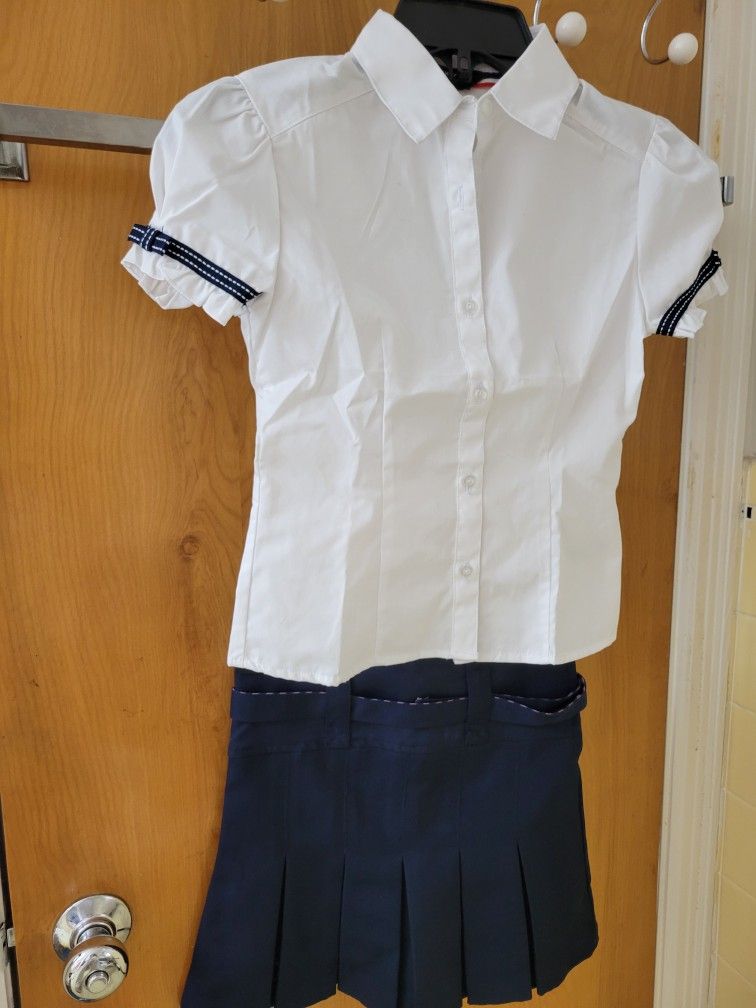 3 white button shirts (French Toast Brand) 3 navy pleated skirts. (US POLO ASSN) NEW JCPENNY Sizes 7. 8, 12/14
