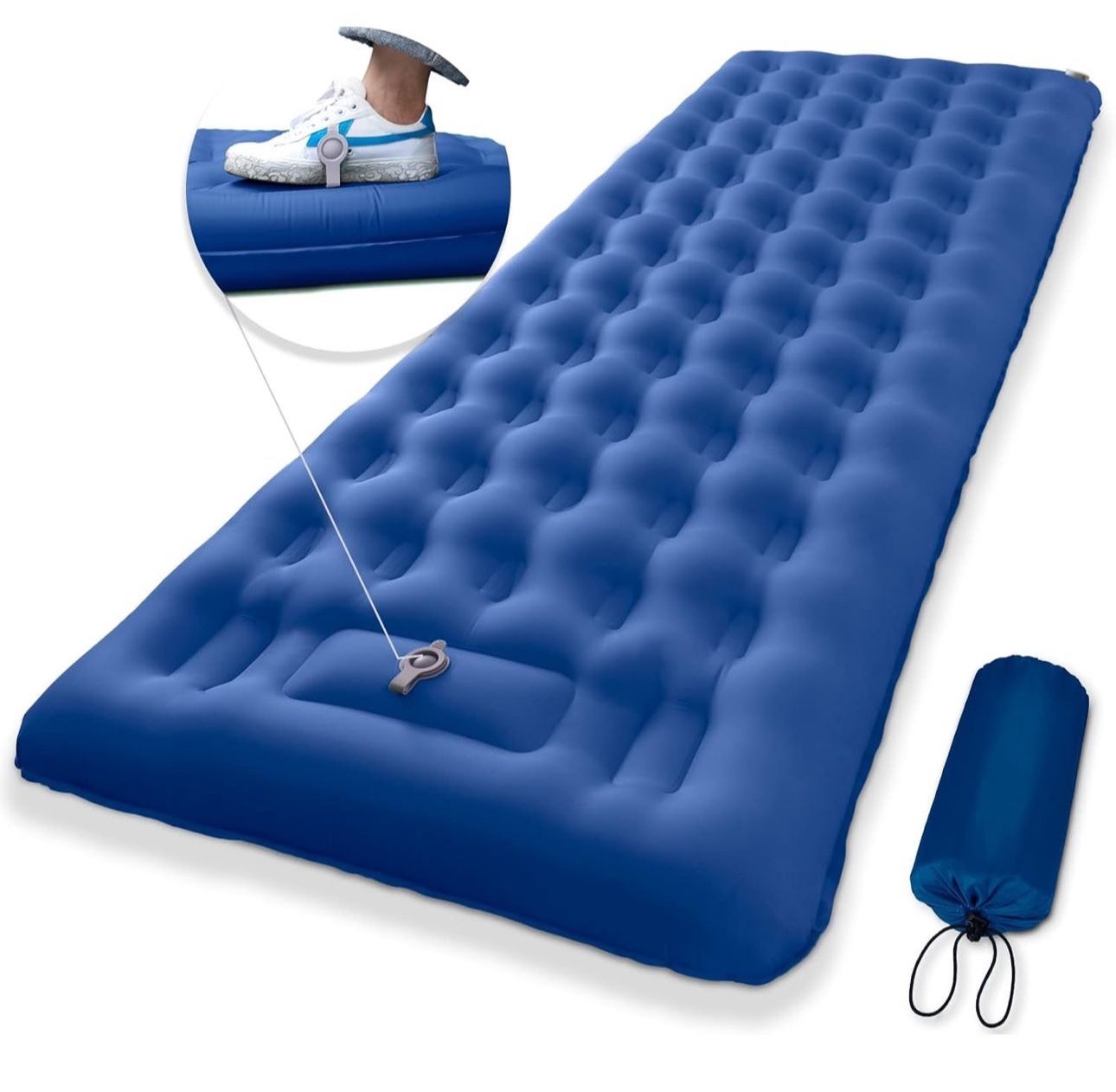 ⛺5" EXTRA THICKNESS FOR MOST COMFORT - Our sleeping pad is made unique multi-point column design. The honeycomb air cells ergonomically support all of your pressure points, no matter lying flat or on side, 5 inch thickness after full air keep you body away from the ground and insulating the coldness, ensuring maximum comfort and warm for your sleep all night long. Let's start enjoying puffy sleep anywhere at any time. ⛺FOOT PUMP QUICK INFLATE & DEFLATE - 2022 upgraded self-inflating sleeping mats, multiple inflation methods meets all your needs. Just easily and quickly inflate the sleeping mat by stomping on or hand pressing the built-in air pump for a few minutes. Double-decked deflate valve design, open the first layer valve is for inflating by mouth or another pump, the 2nd is for quick deflation. So if you haven't got the skill of stomp pump yet, don't worry, you also can inflate the sleeping pad by mouth or other pump though that valve. ⛺UNIQUE INTERIOR STRUCTURE & EVERLASTING DURABILITY - Built for the outdoor activities, the sleeping pad made of durable & outdoor grade materials-40d nylon. Thermoform sealing and TPU coating make the camping pad 100% waterproof and warm which will protect you from the wet ground in the most extreme conditions. With the special internal multi-point column support and honeycomb-column air cell design, not only improve the bearing capacity but also ensure the elasticity of the mattress while not deformation. Look, prefect sleeping mat, start a nice outdoor sleeping experience. ⛺THE BEST COMPANION FOR OUTDOOR CAMPING - The camping pad was designed with you in mind, super lightweight, compact and portable easy to carry wherever you go. The ultralight sleeping mat weighs only 2.2lb, can be folded up to a compact packs as small as 11x5.5 in, just right to fit into a backpack or suitcase, which is strongest camping gear. Perfect for backpacking, camping, car traveling, hunting, beach etc. This outdoor item cover a sleeping pad, carry bag & 2 repair kits.