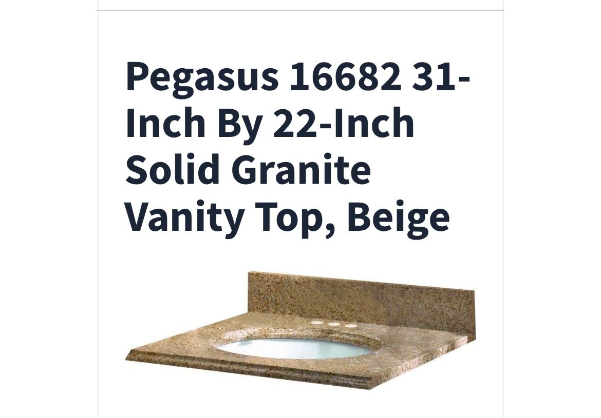 31” x 22” beige granite with white basin. New in the box, purchased some time ago, just now realized it’s the wrong size for the new vanity.
