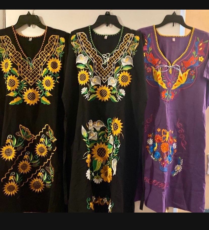 $35 EACH. NEW Mexican dresses are handwoven from Michoacán, MX. The first sunflower dress is a medium (M), the second dress is a size large (L), Purple one is a size 2X-3X. Selling each one for $35!