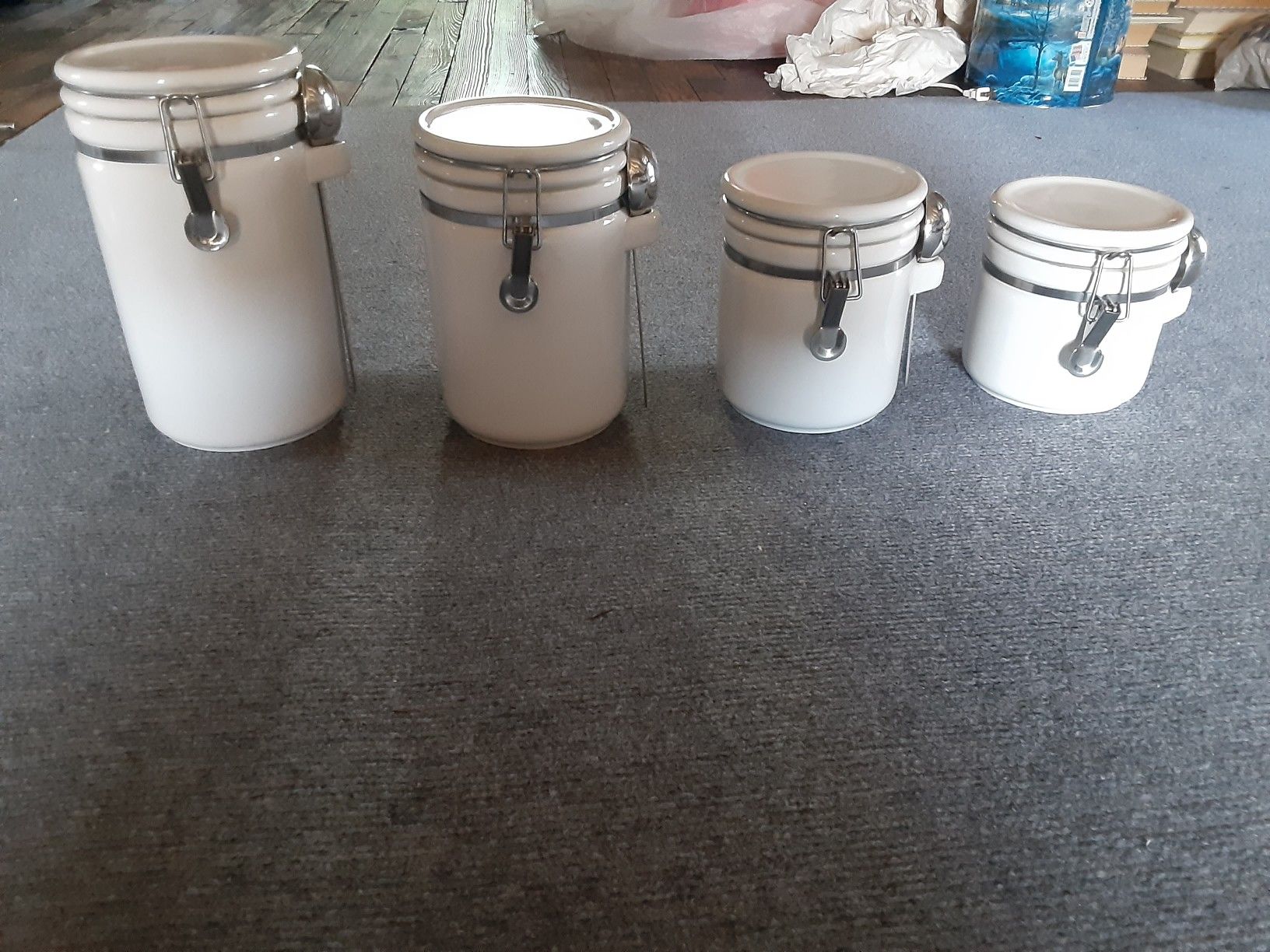 Air tight ....White & silver canisters with metal scooping spoons...great for flour sugar coffee etc.