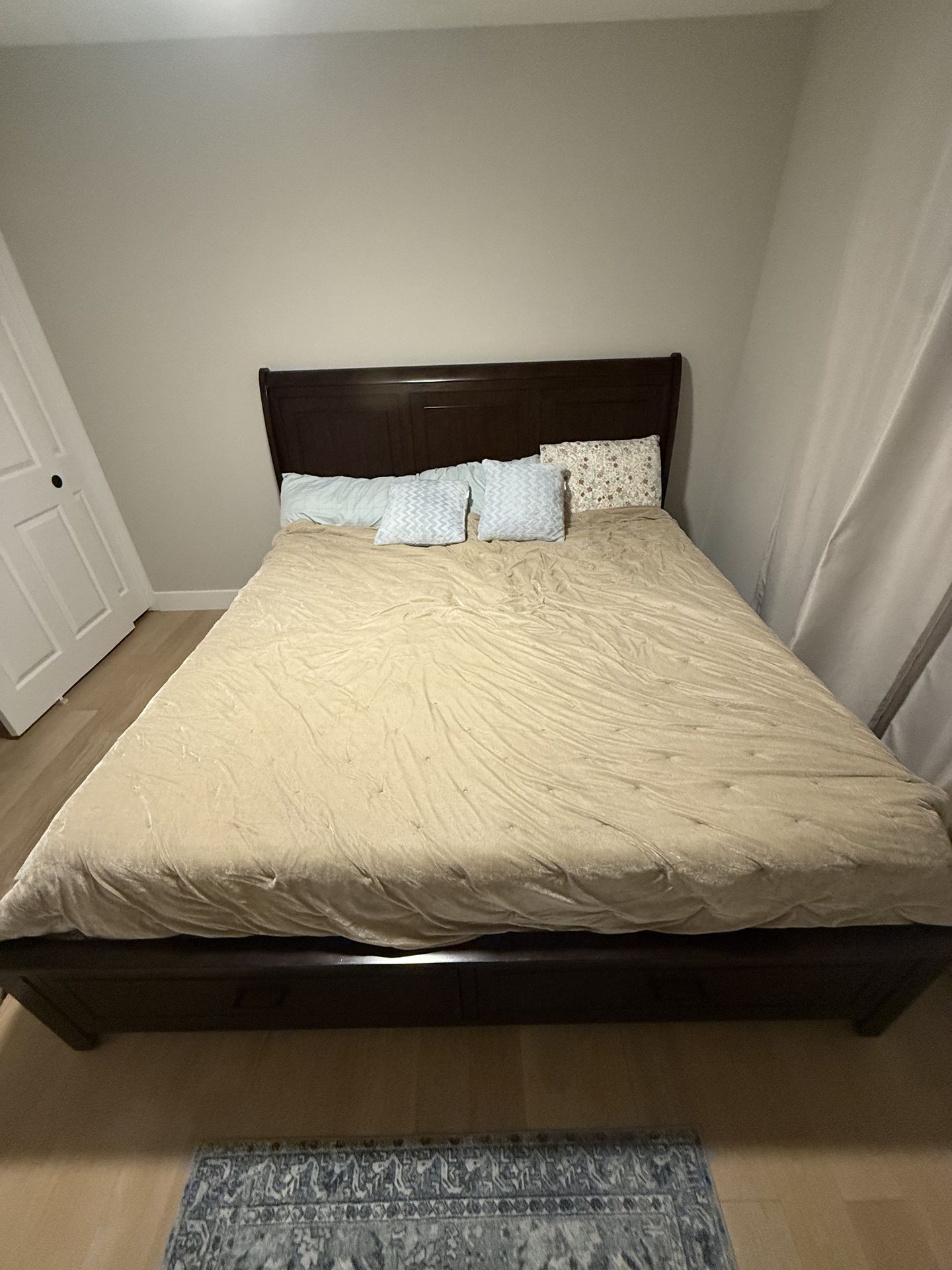 Selling our hardly used extra King bed frame. Solid wood excellent to brand new condition. The mattress is also available for sale. Clearing this extra room for different use of space, need gone asap. No low ball offers please. $250 for bedframe (solid wood work) $450 for mattress (paid over $800 for it less than a year ago, still has wrapping on it)