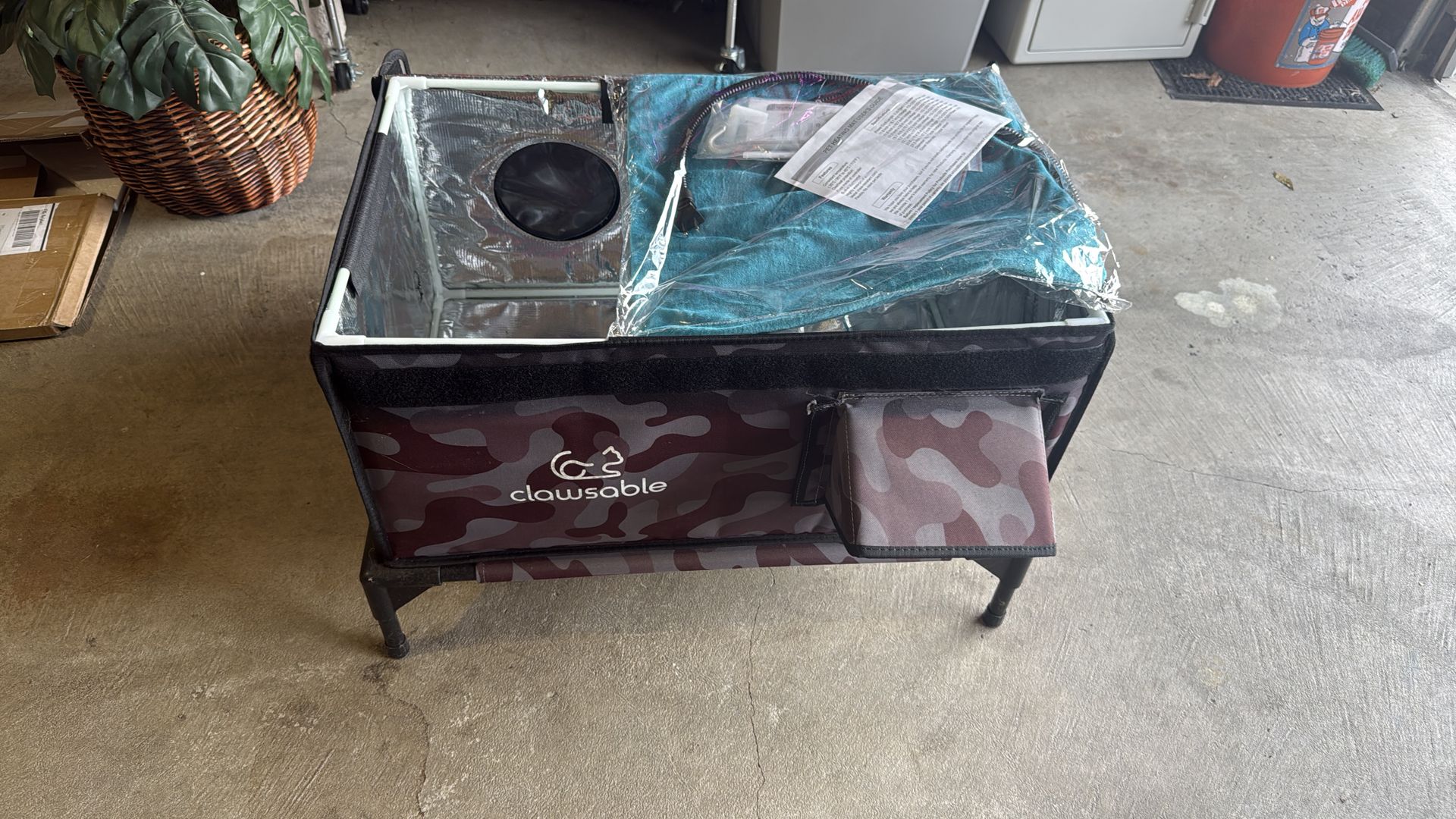 Heated Clawsable cat condo in excellent condition—perfect for keeping your pet warm and cozy. • Built-in heating feature (great for colder months) • Raised off the ground for comfort • Enclosed hideout + side opening • Includes soft bed/cushion + accessories shown • Clean and ready to use Perfect for cats or small pets who love warmth and a private space.