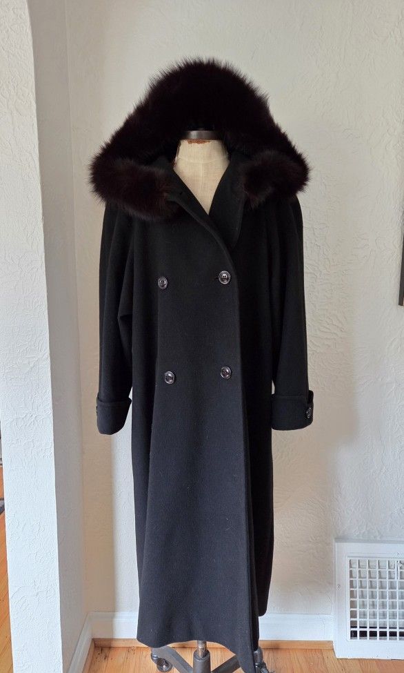 Perfect condition. Big luxurious fox fur hood on double breasted black cashmere overcoat. Women's size 2xl