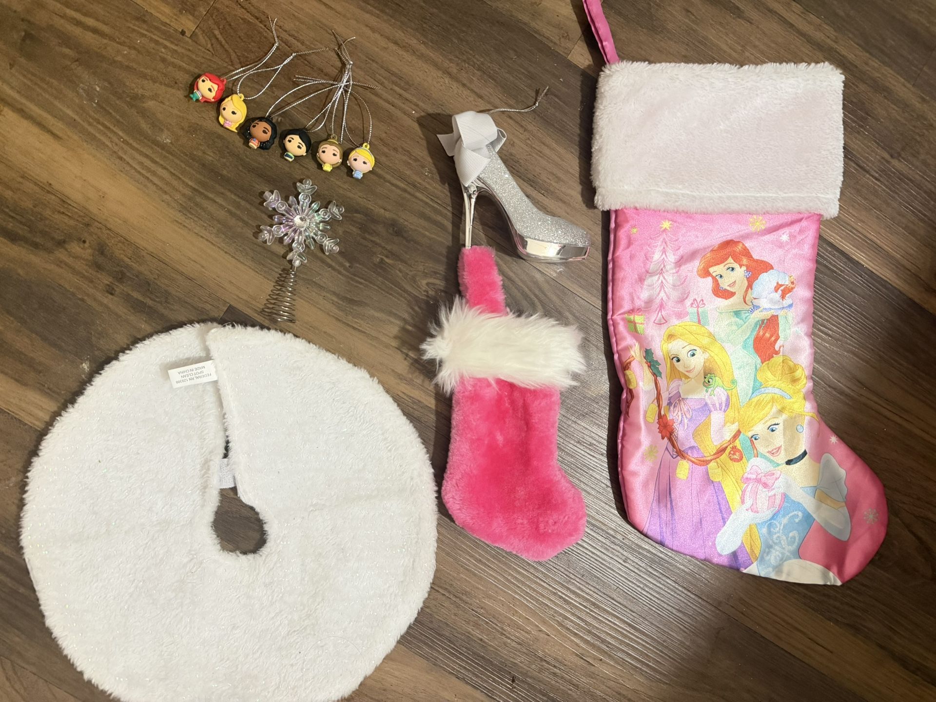 Comes with ππ» 1 brand new Disney Princess stocking 1 mini pink fussy stocking 1 high heel ornament 1 mini white glittery tree skirt 1 mini tree star 6 Disney princesses ornaments Must pickup or meet in Alamo Ranch asking $40 obo serious inquiries only!!! Thank you.