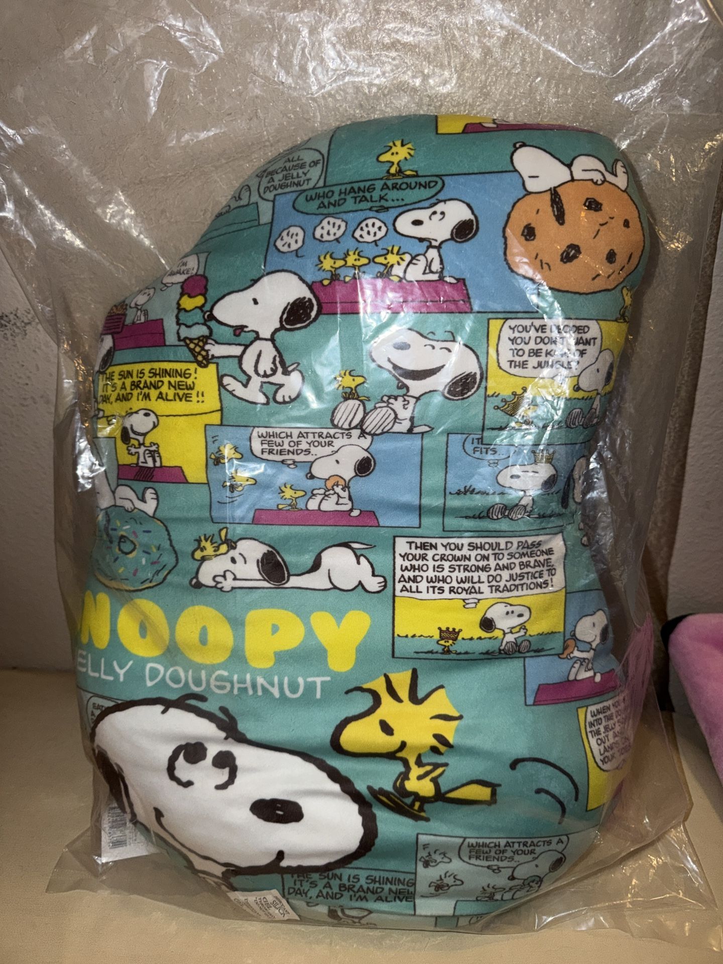 NWT Peanuts SNOOPY Jelly Doughnut Comic Strip Die-Cut Pillow Cushion 19” JAPAN