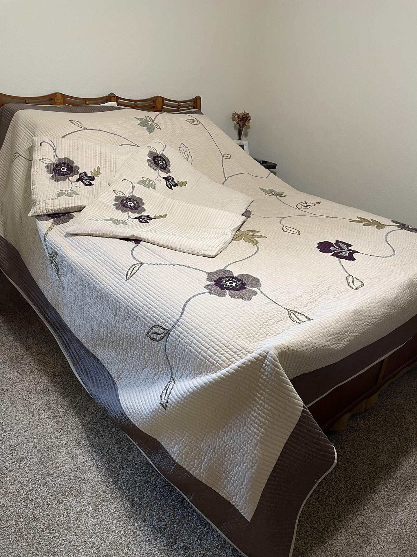 King size quilt with 3 standard quilted pillow shams and one decorative pillow. Smoke free home.