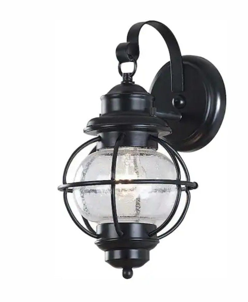 Awesome coastal wall lantern inspired by the vintage lanterns sailors once used, this lantern casts a warm glow on your entry way with its clear seeded glass shade and nautical appearance. Although its design looks as if it was plucked from an old ship, this wall lantern also complements vintage industrial themes when used with an Edison bulb for vintage flair. Install next to your doorway or in your hallway to showcase your antique coastal sense of style. * 1 light bulb outdoor wall sconce for entryways and garages *Deep black finish with seeded glass shade *Use with a vintage bulb for a warm classic glow *Requires 1 - 60-Watt (M) bulb - not included *Hardware included *Wet location approved I HAVE 4 UNITS AVAILABLE ALL IN BOXES Original price $80