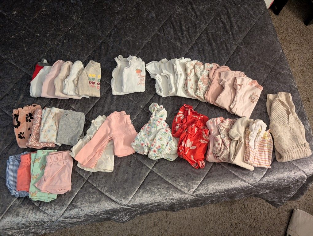 Baby girl clothes, mostly 3-6 months. 4 pants, 5 long sleeve onesies, 2 tank top onesies, 8 short sleeve onesies, 2 tops, 4 shorts, 2 outfit sets, 5 jumpers/dress, 3 pairs shoes, 1 teething mitt, 5 swaddles/sleep sacks, 2 pajama sets, 4 sleepers, bows & hats Will be adding more items as I go through her stuff.