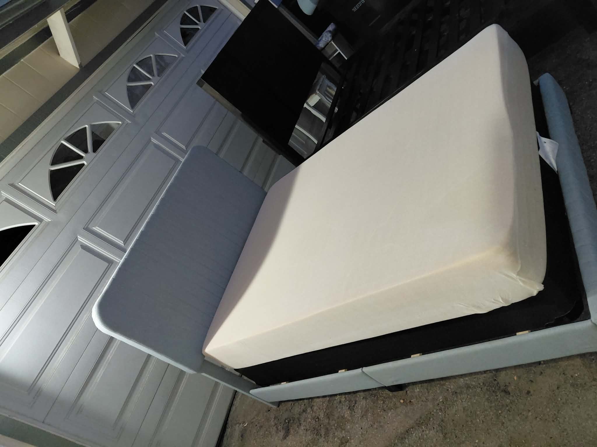Full size bed light blue with memory foam mattress ready to go unassembled ask us about our delivery π