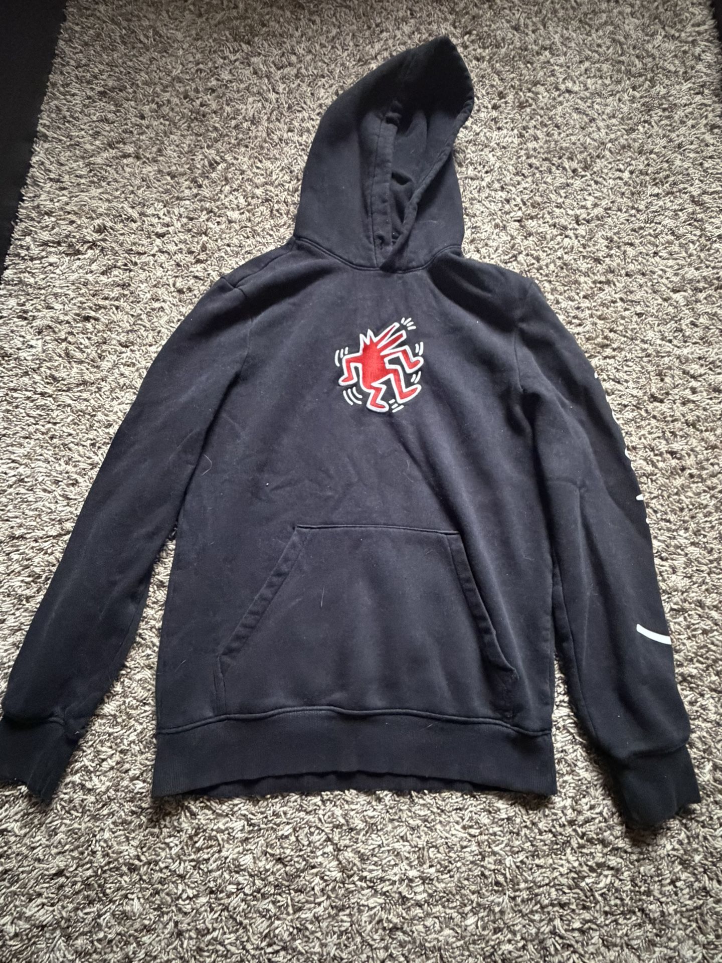 Size Small Super clean black hoodie featuring bold Keith Haring–inspired artwork. Front has the iconic red dancing figure, with a large graphic design on the back and text detail down the sleeve. Really eye-catching piece.