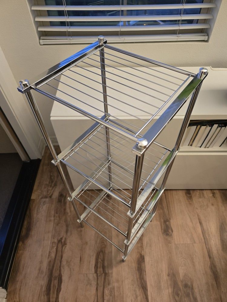 4 tier shelving unit stainless steel in excellent condition. Can be used for multiple purposes like decoration corner, towels Organizer, toiletries, plant shelving, ...etc. pet free smoke-free home.