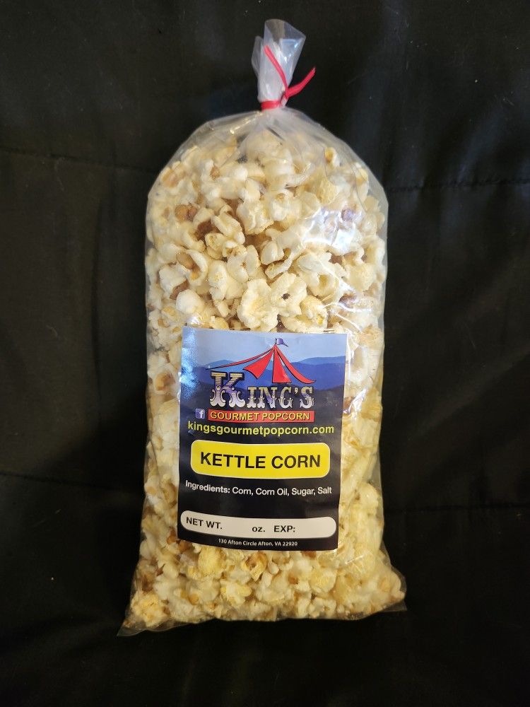 King's Family Secret Recipe!!! Tasty gourmet kettle corn. 7 oz bag. All popcorn, no air!! Visit King's at 130 Afton Circle, Afton, VA 22920 (Rt 250) mention this ad for free sample. Shipping price depends on destination, please indicate your address. Shipping at least 3 bags gives best shipping deal. Ask about quantity prices, for product and shipping. Custom orders.