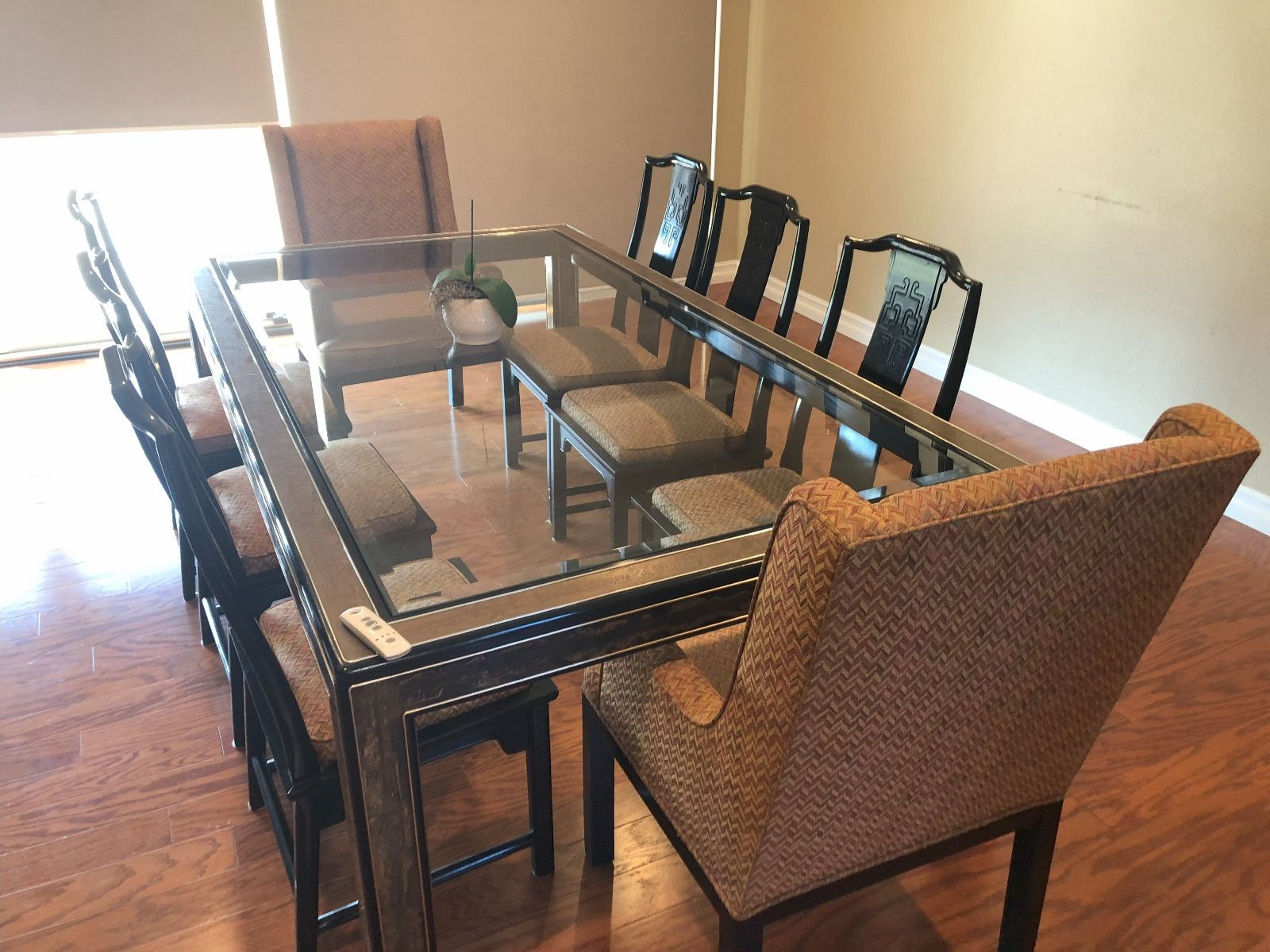 Glass top. Excellent condition. 84 by 48 inches. Chairs not included. Paid 3000. Glass very heavy. Make offer.
