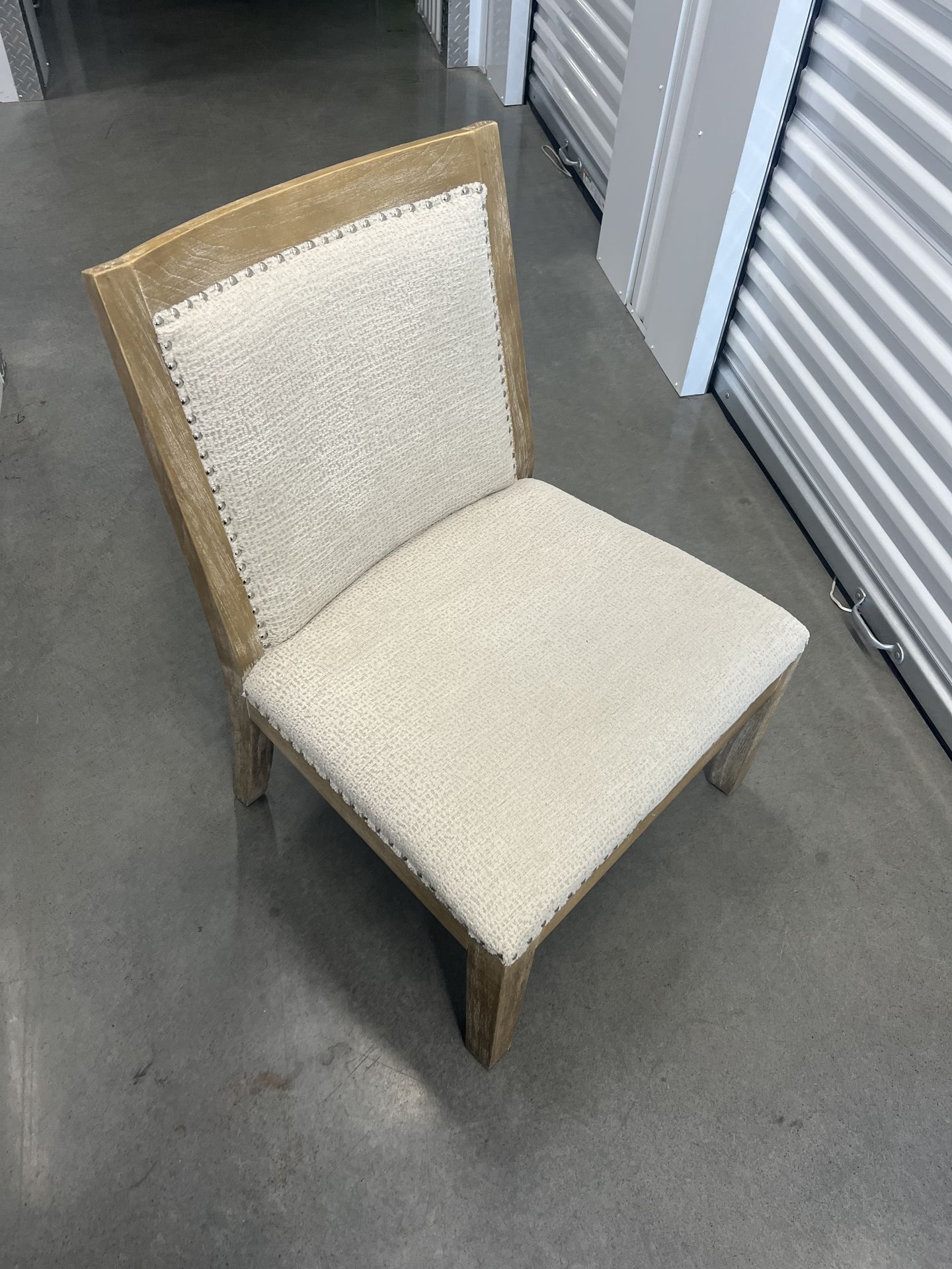 Beautiful white chair with silver nailhead trim detail. Very clean and in great condition. The wood is designed with a distressed finish. Was used in a facial studio in a non-smoking, pet-free environment. Asking $20.