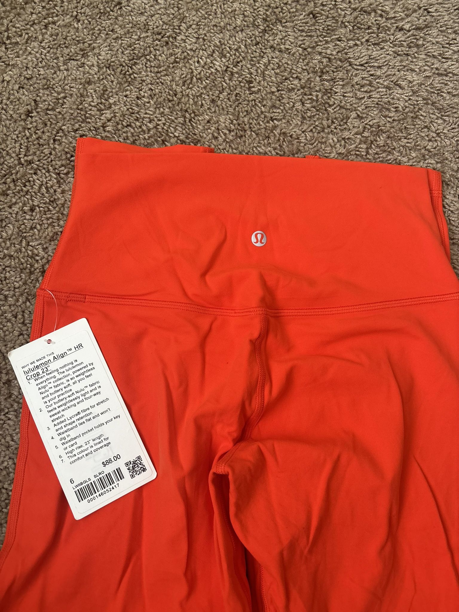 Lululemon Align™ High-Rise Crop – Size 6 • Color: Bright Orange • Condition: Gently used, great condition • Size: 6 • High-rise, 23” length • Features: • Buttery-soft Nulu™ fabric, weightless and sweat-wicking • Four-way stretch with added Lycra® for shape retention • Flat waistband with pocket for key or card • Lined for comfort and coverage • Brand: Lululemon • Original Price: $88 Price: $70 Pickup: Five Points, Denver