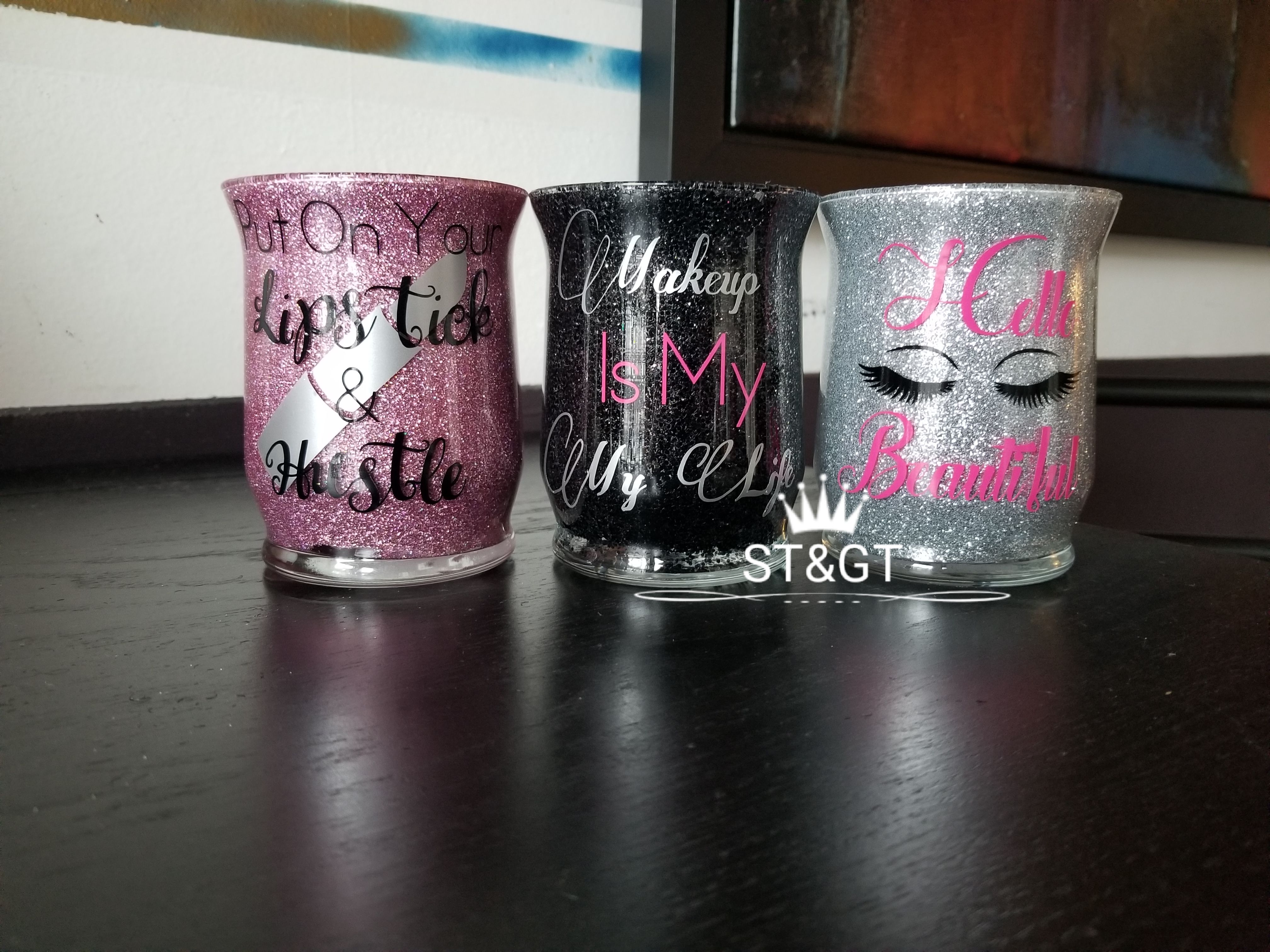 I design glassware. All brush holds are hand made by me and can be personalized to your liking. (Glitter and Sayings can be changed. $12 each. To see more items that I personalize, please visit my Instagram page @SparkleThisAndGlitterThat