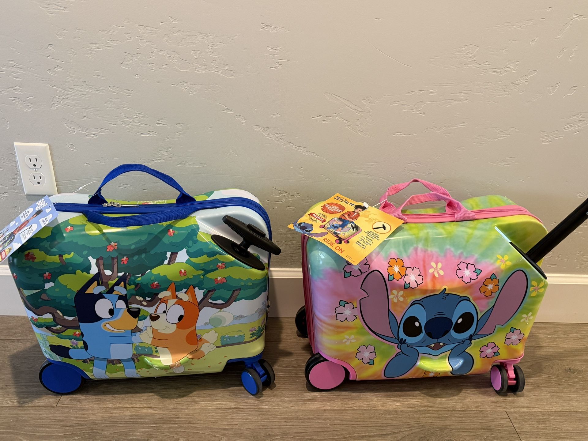I will not respond to well offers, thank you. Price is per item. Brand new with tags attached. Stitch or Bluey. Extendable handle and zipper closure. Rolls easily while your little one cruises through the airport. From a clean and smoke free home.