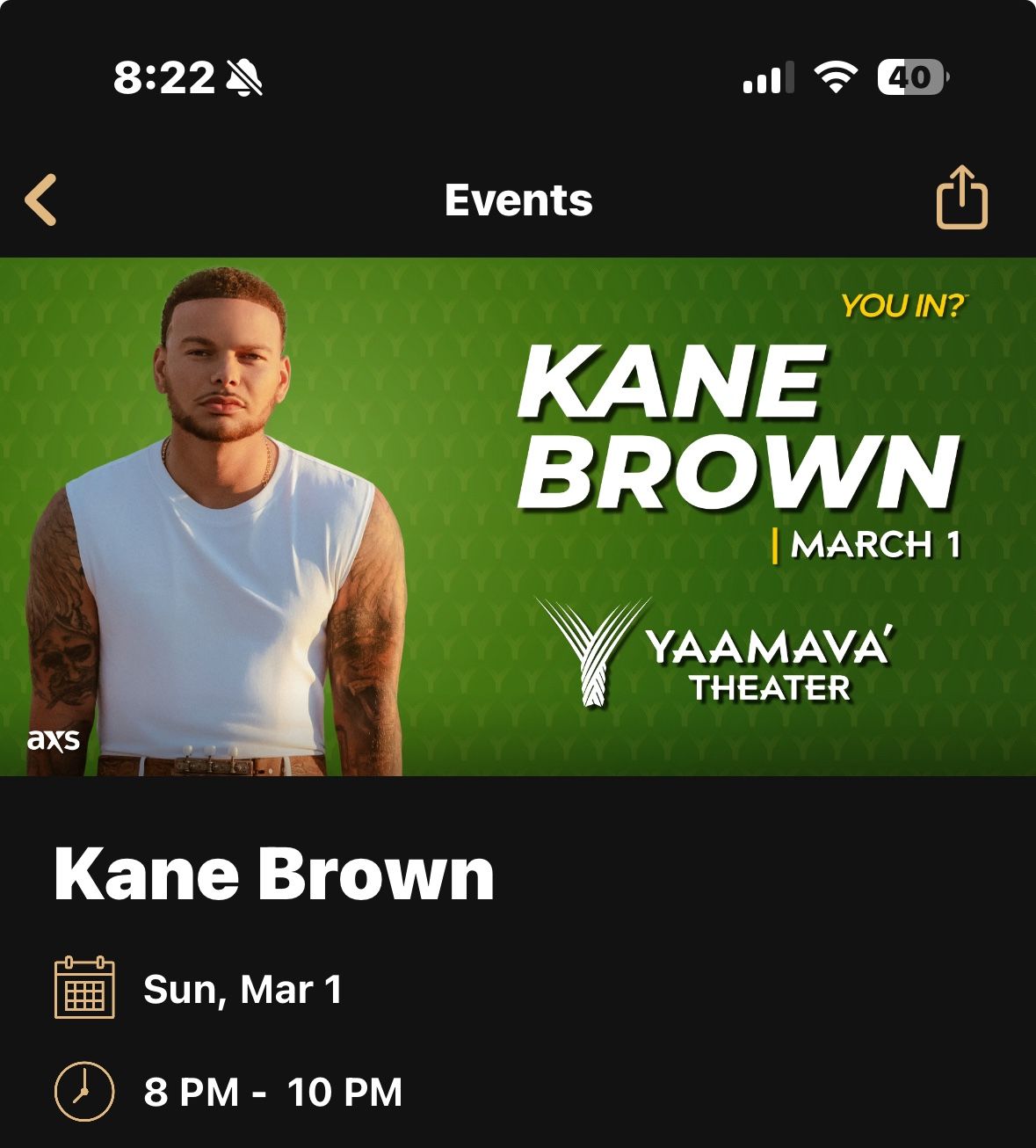 2 tickets to Kane Brown 3/1 50% to secure tickets Tickets determined concert day Range from 400-100-VIP