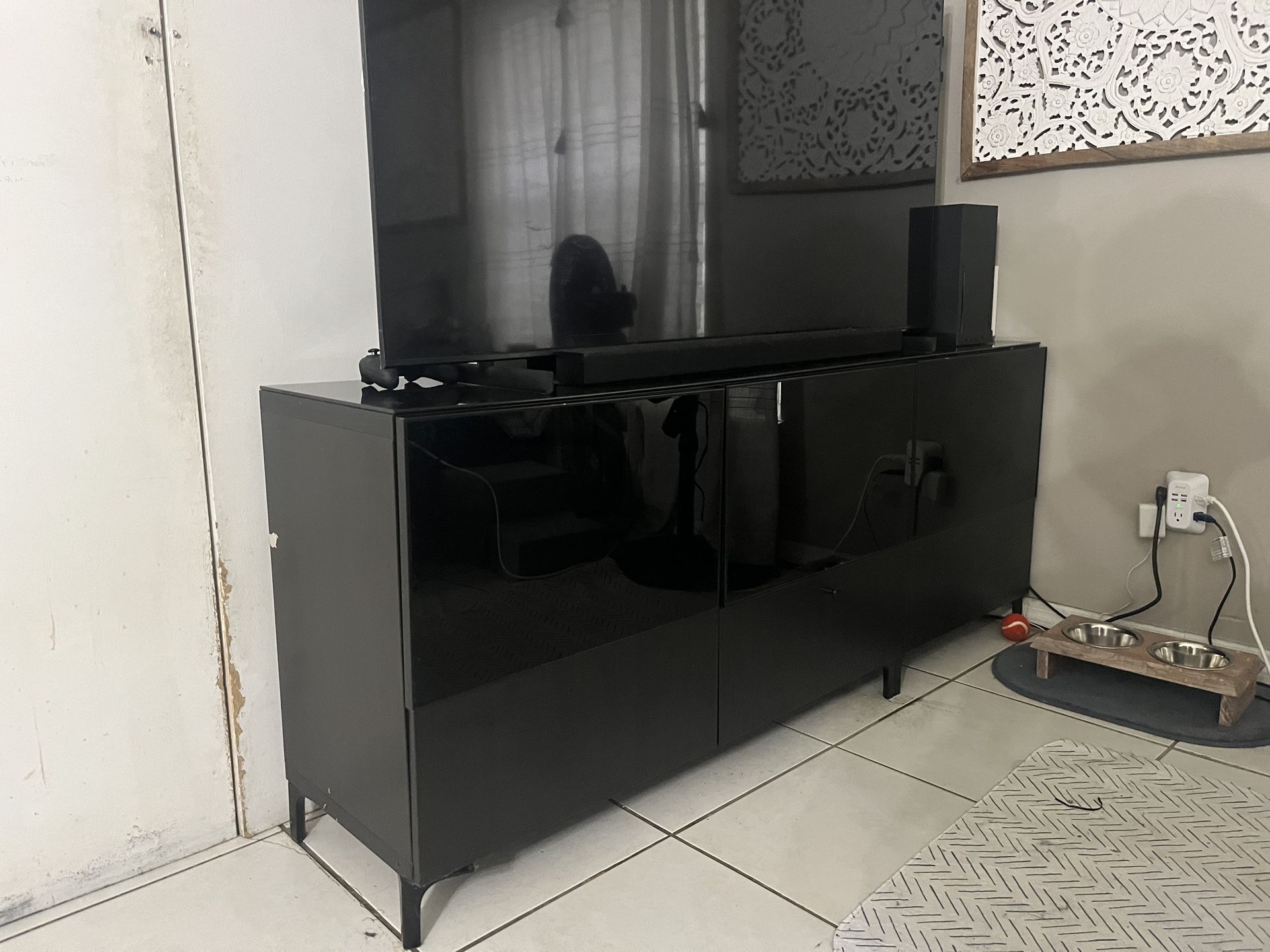 Black tv stand has draws and cabinets for plenty of storage can fit up to 75 inch possibly 80 inch tvs pick up only