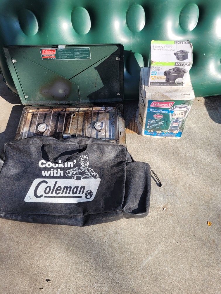 Camping gear (1) queen. Mattress, propane stove and propane Lantern all I working condition.
