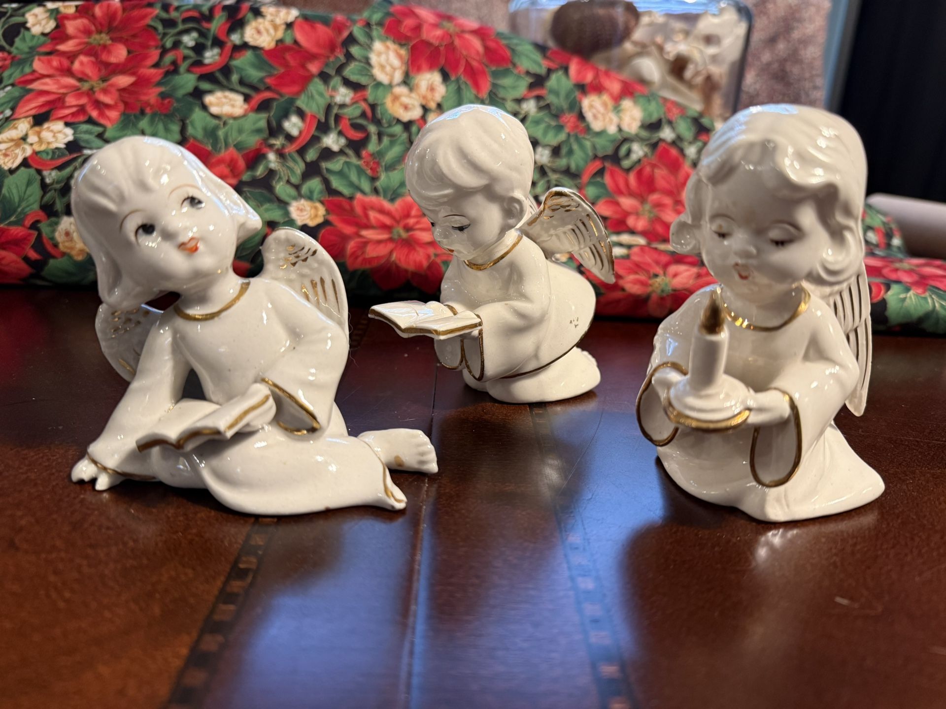 Handed down for a few generations, now it’s time to find a good home for these guys. Beautiful white porcelain with gold trim, made in Japan. Tallest 3.75.” For their age they’re in great condition, though the corner of the boy’s book has been carefully glued in place. Cash only, no electronic payments.