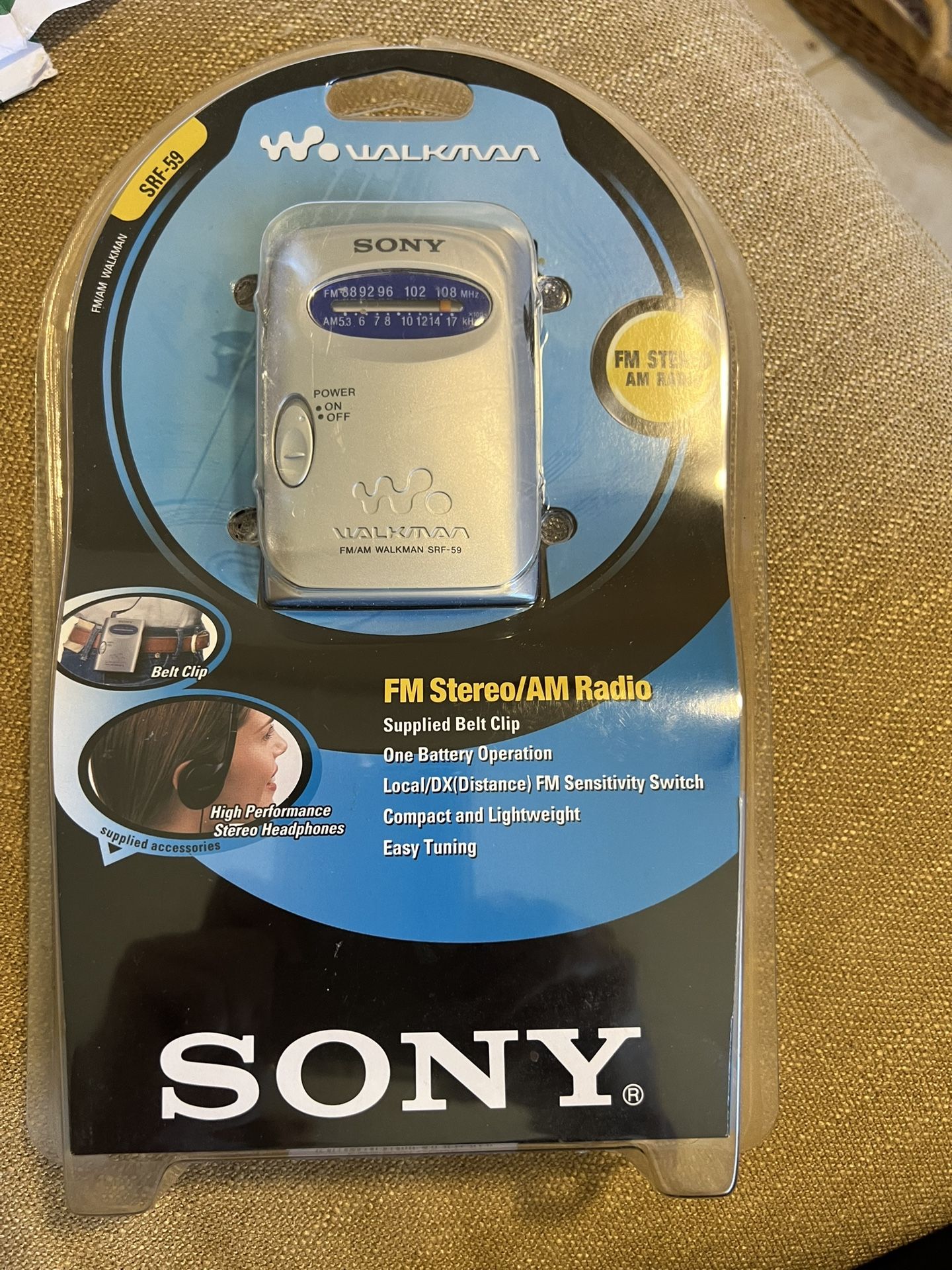 Sony Walkman SRF-59 FM Stereo/AM Radio, portable radio device. It was most likely manufactured in 2001. It features FM stereo and AM reception, comes with a belt clip and stereo headphones, and operates on one battery. It also includes a Local/DX (Distance) FM sensitivity switch, known for its compact and lightweight design, and easy tuning capabilities. Unopened and Original packaging!