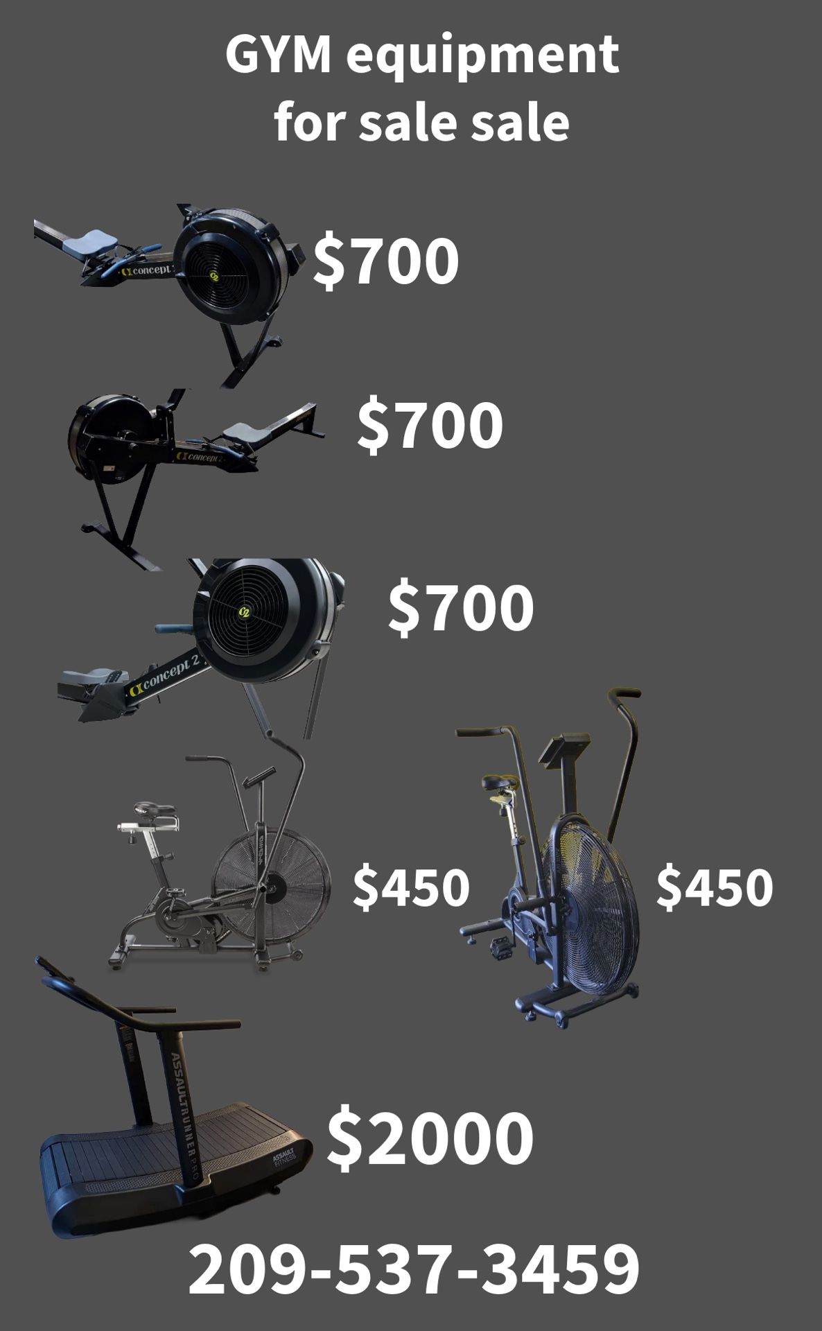 Gym equipment for sale 3 Concept 2 Rower with PM4 everything works $700 each. 2 Assault bikes great condition $450. 1 - Assault runner great condition like new $2000. All equipment as been kept maintenance and clean. Please contact me If you really interested make appointment to come see them.