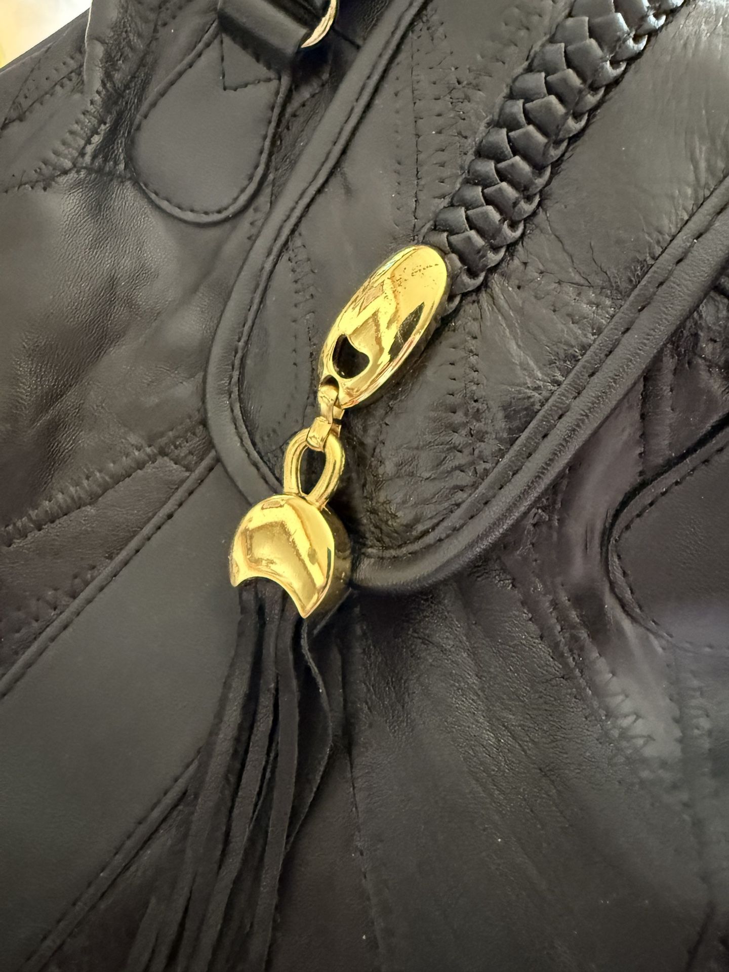 New .. Ladies z.. Purse .. Pocketbook .. Shoulder Bag .. sharp looking .. Black .. Braided with charm .. Buckle … Tassel .. zippers .. Snaps shut .. Shell .. patchwork .. Lambskin .. Lining .. Polyester .. Straps …. — 18.5 .. — 19 “ Long .. New without tag . .. Very .. Sharp looking .. Stylish .. Questions — Ask Shipping .. Available Cash .. Only ! Pickup SALEM .. VA