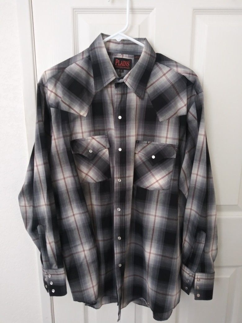 Men's "Plains" Western Style Long Sleeve Shirt. Pearl Snap Buttons Down Front And On Cuffs. Size Is Large