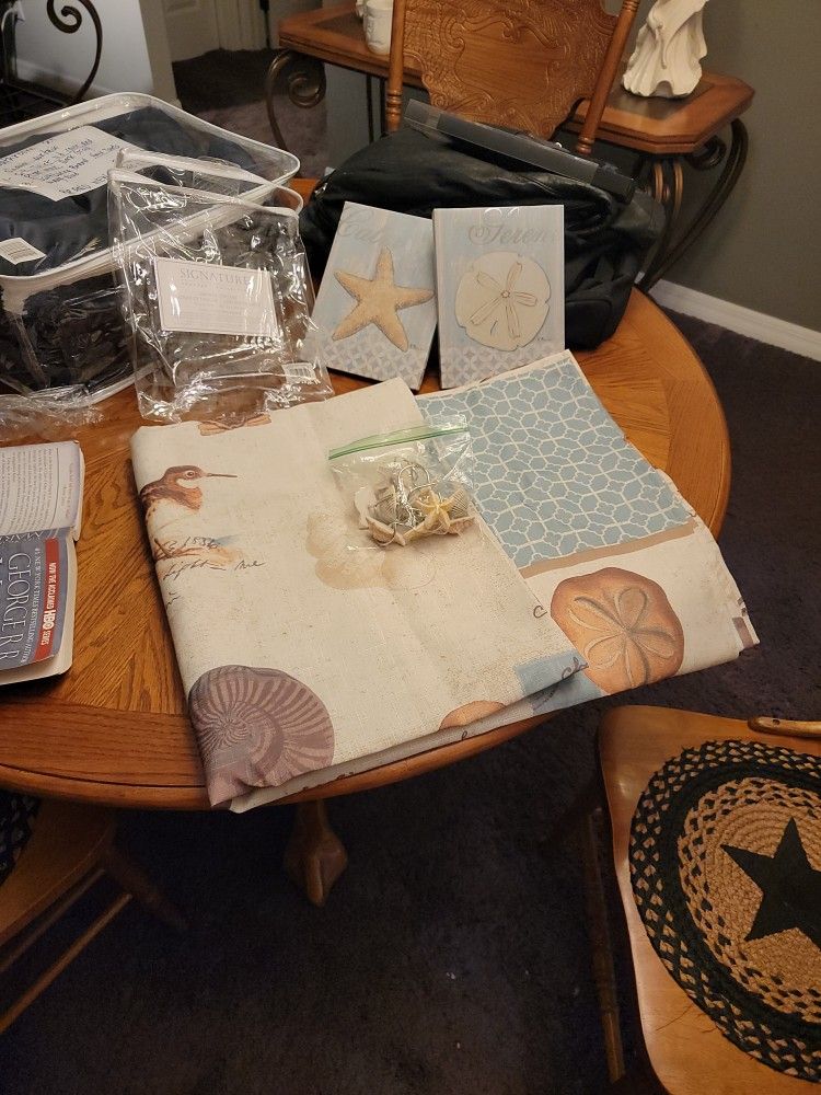 BRAND NEW SHOWER CURTAIN BETTER HOMES & GARDENS, COASTAL SEASHELL & BIRDS PRINT, POLYESTER, BLUES. TAN, CREAM COLORS. 12 NEW SHOWER CURTAIN HOOKS RESIN SEASHELL SHAPES. 2 CANVAS WALL ART 5 X 7. NO FLAWS, LIKE BRAND NEW SET ASKING $40.00 MANY OTHER HOME DECOR ITEMS FOR SALE