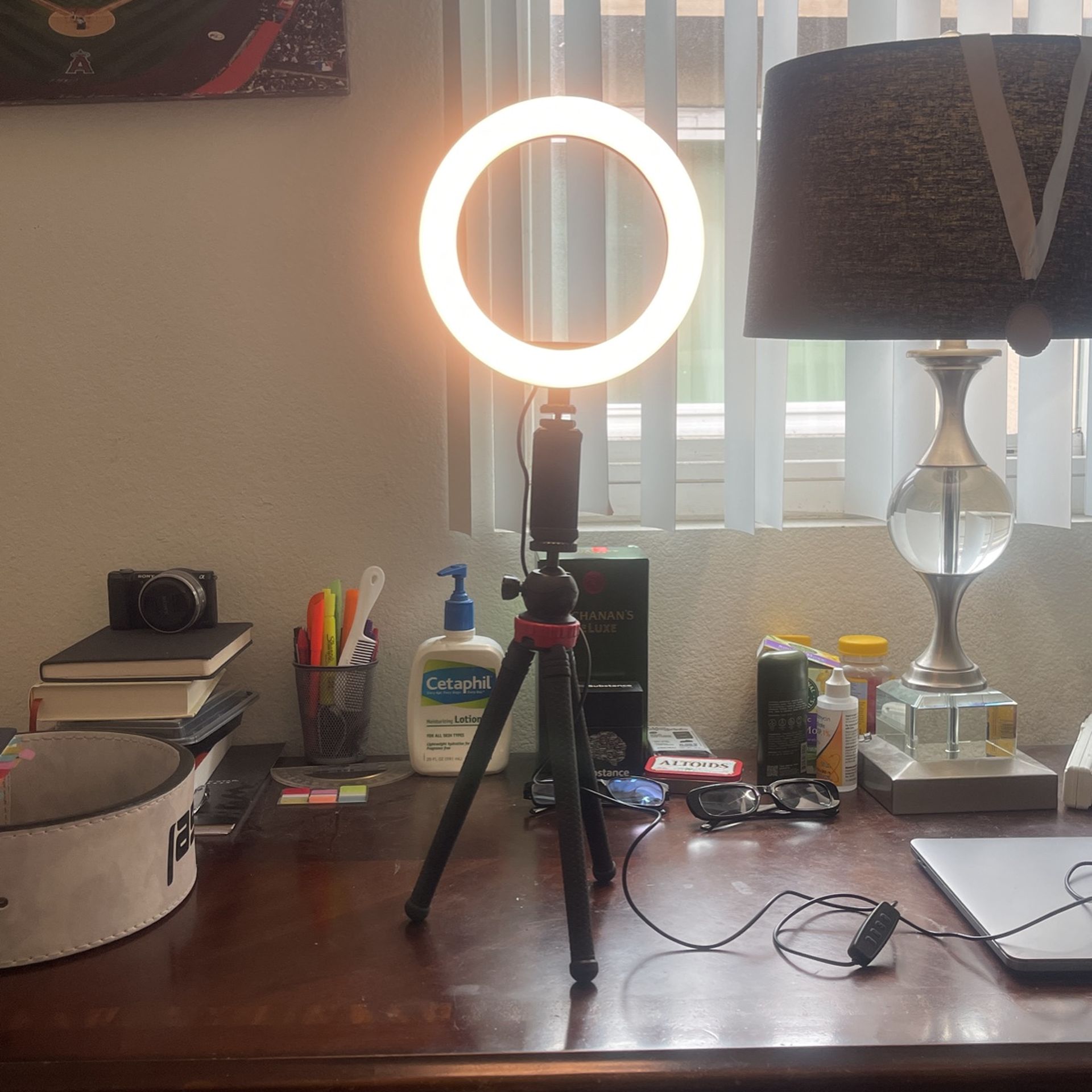 Don’t use this ring light, takes up too much space for me - Remote - 3 different lights - phone holder - Tripod (holds camera as well)