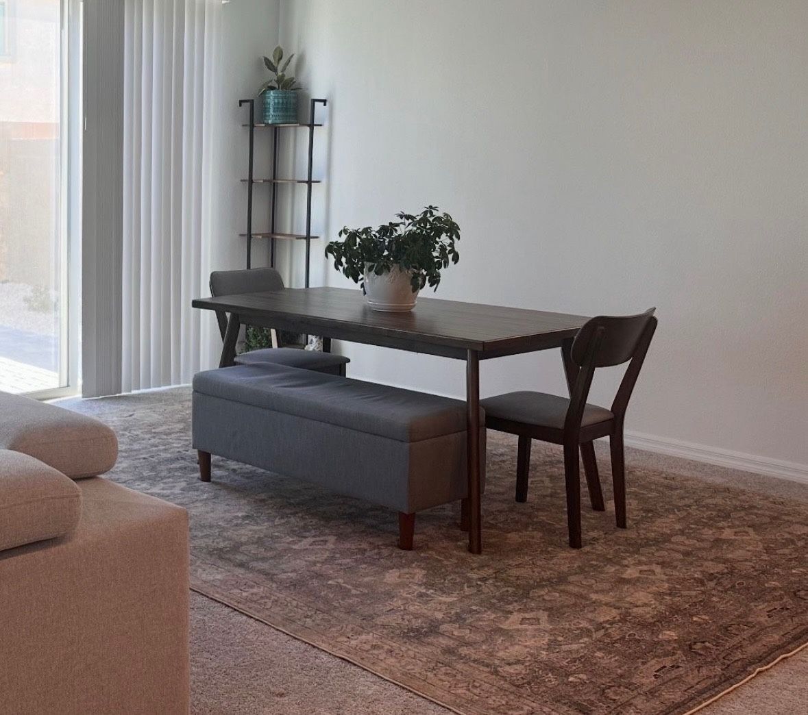 Both table and chairs are from living spaces. Smoke free & pet free home Small nick on the table. One of the legs on a chair broke but has been restored. BENCH IN NOT INCLUDED!