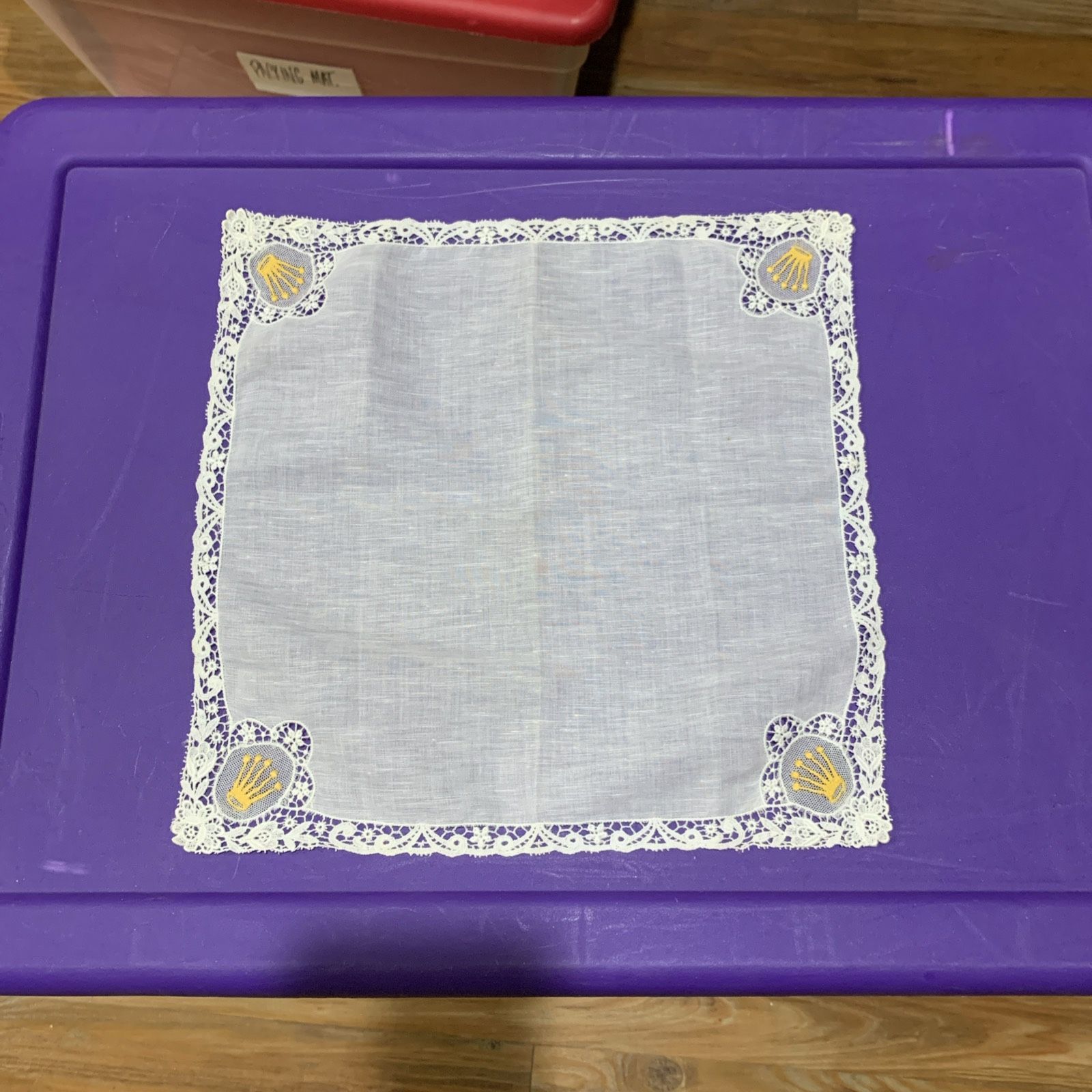 Vintage Hankie white laced edging with gold crowns each corner 11.5x12”