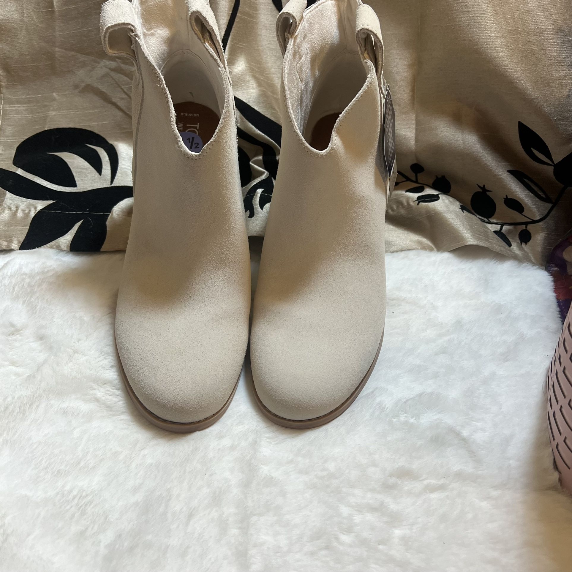 NWT **There are minor blemishes/spots from trying on-from store. Sole has no scuff marks, no signs of use. TOMS is a brand dedicated to meeting high standards for sustainability and social responsibility. TOMS® Constance booties with a gorgeous ankle-length silhouette and elevated block/stack heels. Suede upper. Textile lining and high-rebound comfort OrthoLite Technology. Slip-on style. Round toe construction. Pull tabs. Rubber outsole. Measurements: Heel Height: 2 1⁄2 in Weight: 1 lb 1 oz Shaft: 5 in