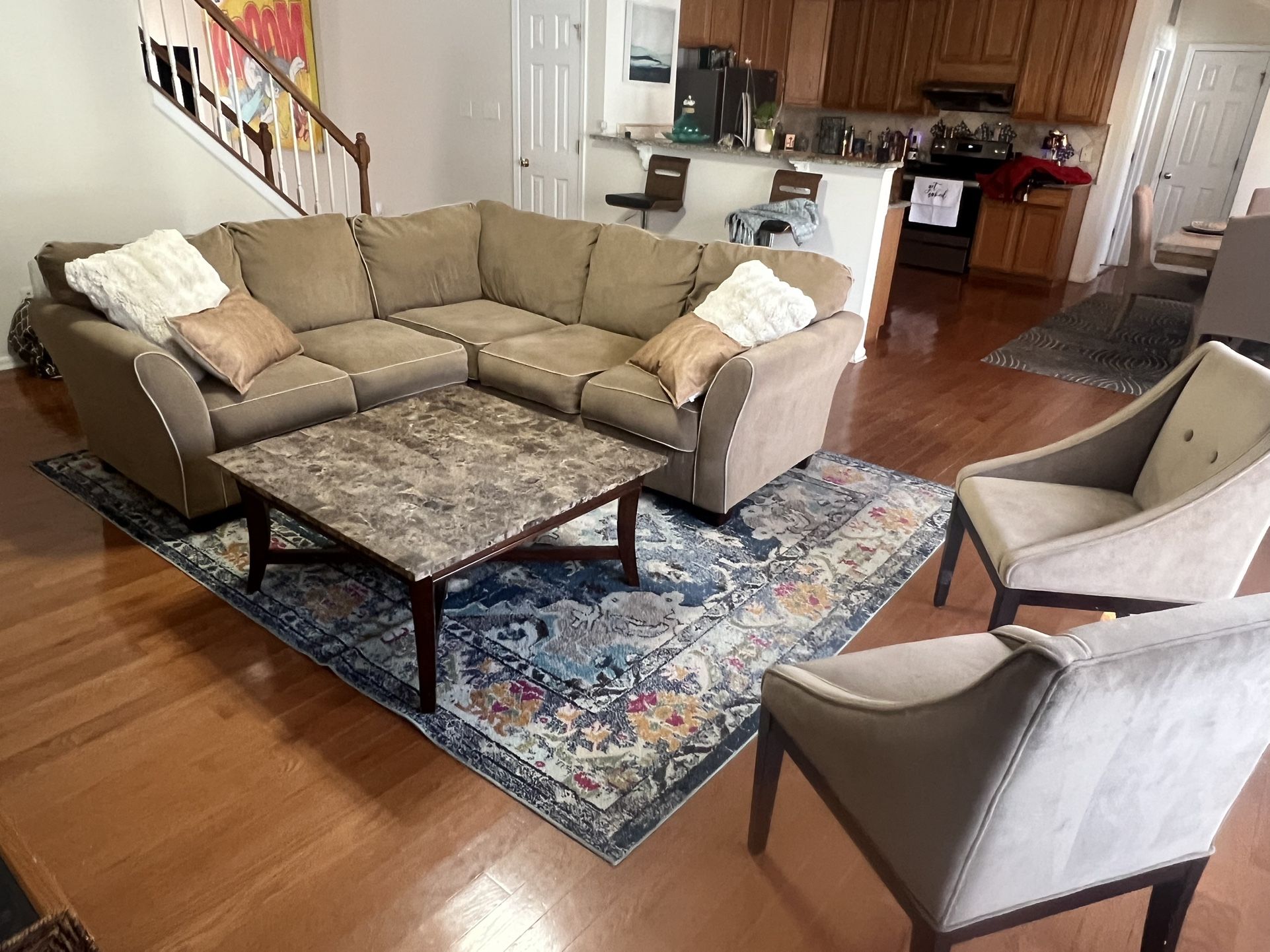 Designer living room set paid over 4 k for everything 2 chairs plus L couch and marble table and center piece included