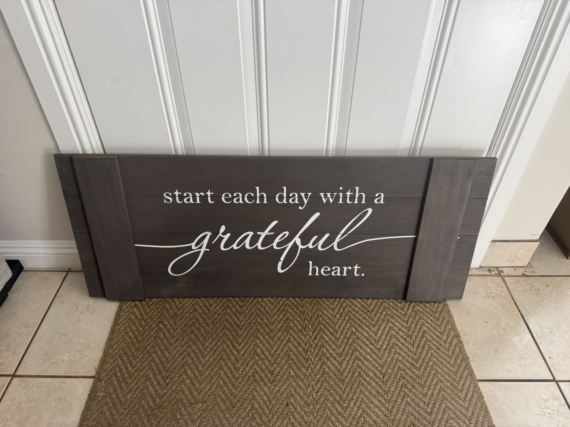 Beautiful rustic wooden wall sign featuring the inspirational quote: “start each day with a grateful heart.” The dark wood finish and elegant white script make it perfect for entryways, living rooms, bedrooms, or office décor. Great condition—clean, sturdy, and ready to hang or display. Condition: Excellent Style: Farmhouse / Rustic 40” L x 16” H
