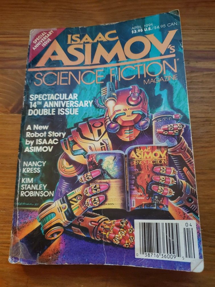 I have a poor copy of an Isaac Asimov's Science Fiction magazine from April 1991. This issue is in poor quality. The cover is torn and has been attached with packing tape. Just seeing if anyone wants something to read.