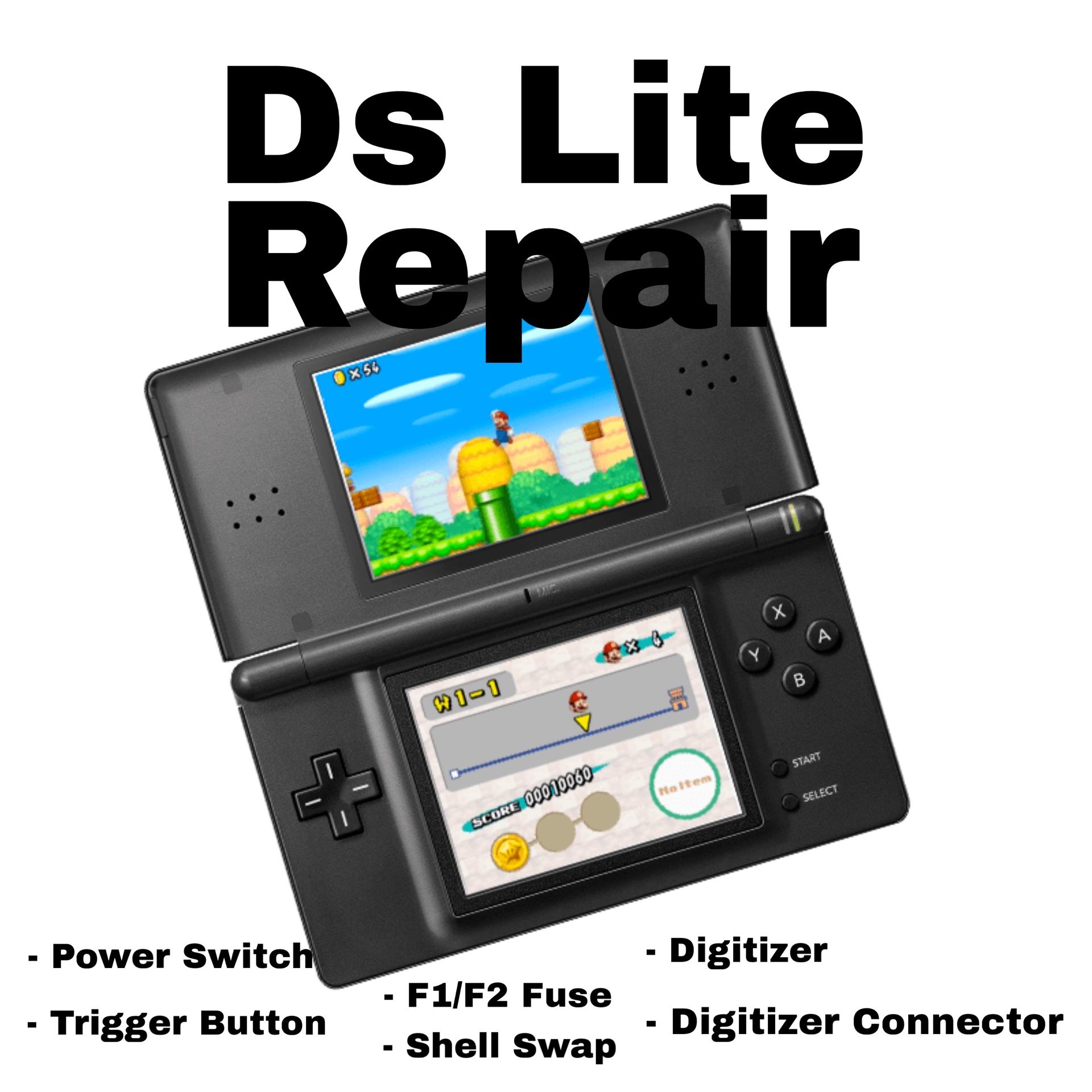 I can help you repair issues with your Ds lite that you’re having. Mainly if something broke on your Ds lite motherboard. This will require me to open the Ds lite to get to the motherboard. Services I offer: - Power switch replacement: $10 - Tactile trigger replacement: $10 per trigger - F1/F2 fuse replacement: $10 per fuse - Digitizer replacement: $15 - Digitizer connector replacement: $10 - Shell Swap: $30 (you’ll need to bring your own shell)