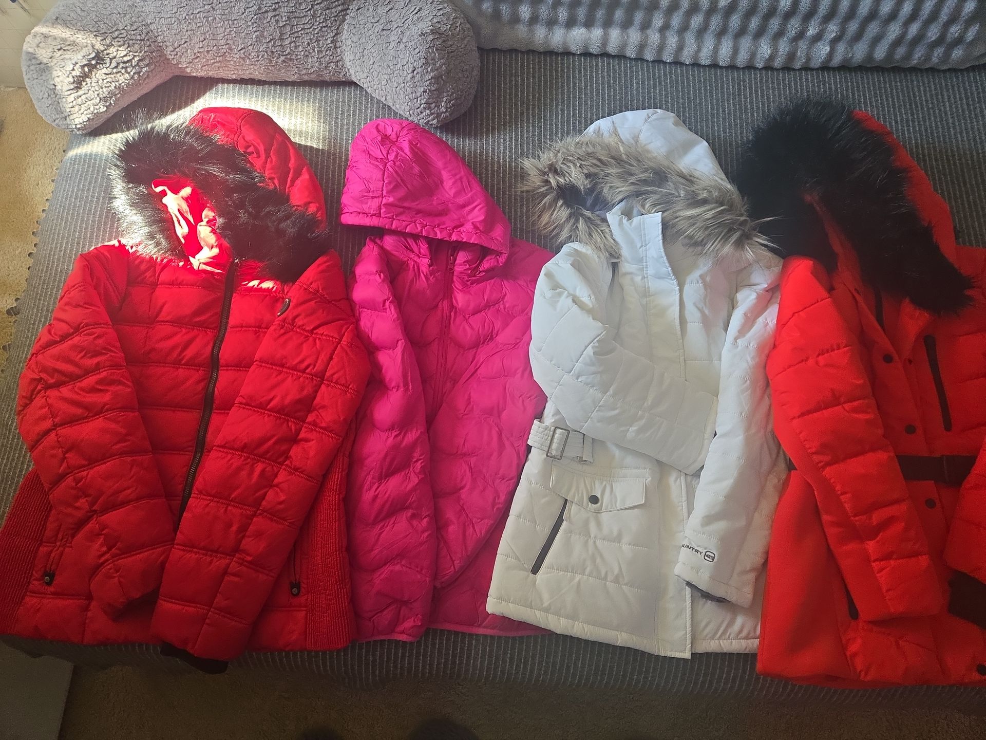 3 jackets (white and two red jackets) are never worn,purple one is worn few times and in very good condition Selling new jackets for $25 each and purple one for $10.
