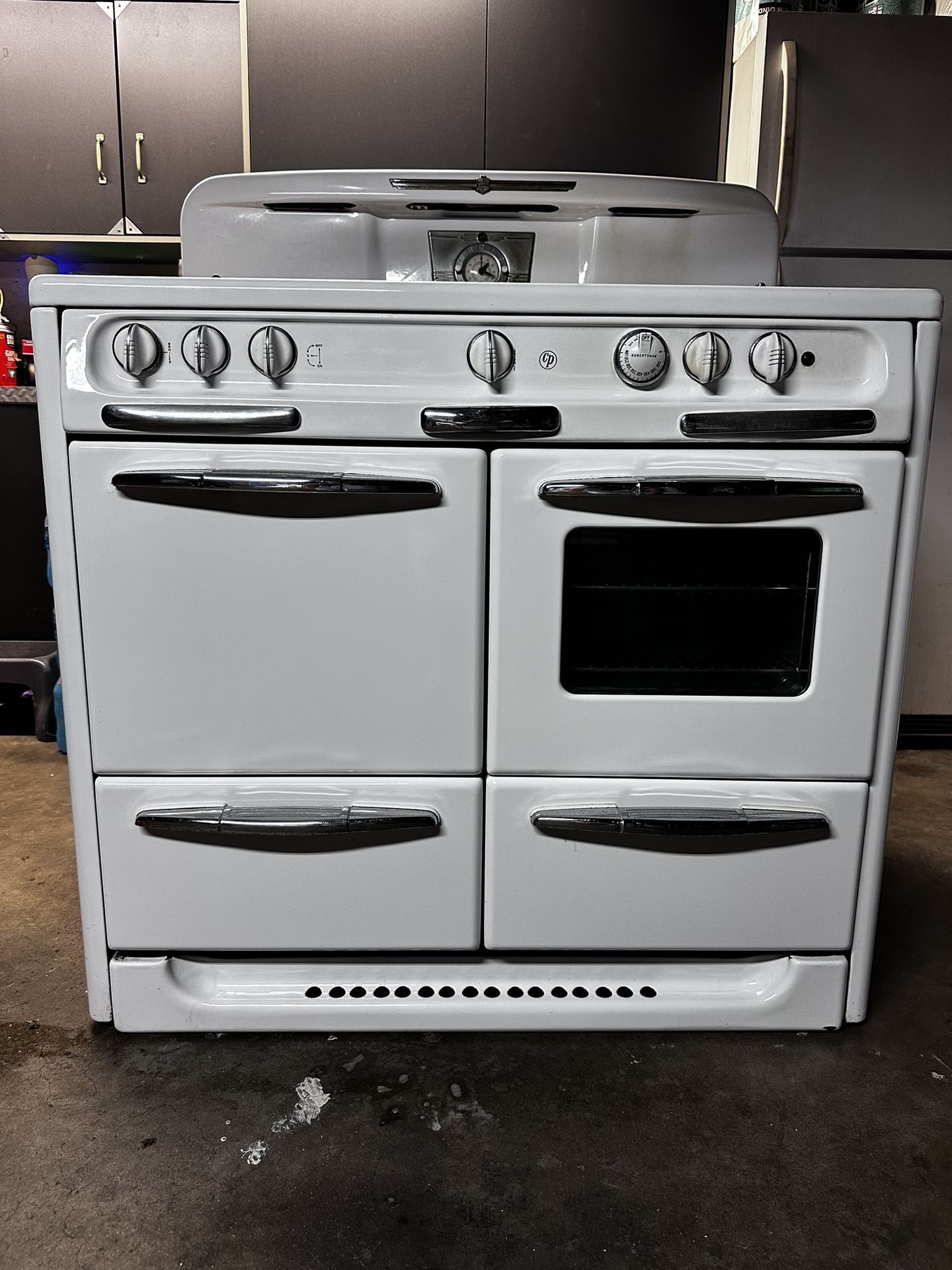 WEDGEWOOD 1951 CLASSIC 40" GAS KITCHEN STOVE RANGE DELUXE. This appliance was in working condition when we last used it many years ago. It has been in my garage covered and is a beautiful stove. I do suggest like any appliance this old to have it serviced.