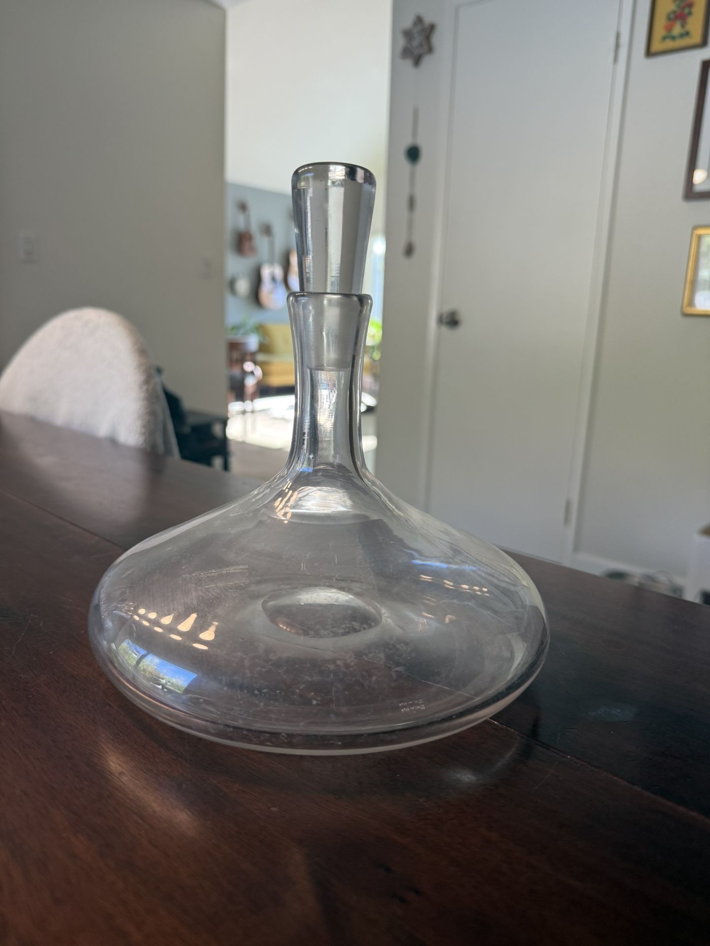Stunning 1950s–1960s hand-blown glass carafe in the classic “ship’s decanter” style — the one you always see in old movies on the captain’s table or a stylish mid-century bar. - Hand-blown clear glass with the most beautiful rounded, organic shape - Subtle trapped air bubbles and a faint pontil mark on the base — unmistakable signs of true hand craftsmanship - Original matching faceted glass stopper fits perfectly and adds incredible sparkle when the light hits it - Wide, stable base and generous pouring neck — ideal for red wine, whiskey, water, or just looking gorgeous on display - Approximately 9–10 inches tall with stopper in place Condition: Excellent vintage. No chips, cracks, or repairs anywhere. The interior has only the lightest natural haze from decades of gentle use (adds character and disappears completely when filled). Glass rings like a bell when tapped. Stopper seats snugly with no wobble. Unmarked, as almost all of the finest European (Italian / French / Scandinavian) blown pieces from this era were — this is the real thing, not a modern reproduction. Perfect for the mid-century modern home, a home bar, wedding gift, or anyone who appreciates timeless glass artistry.