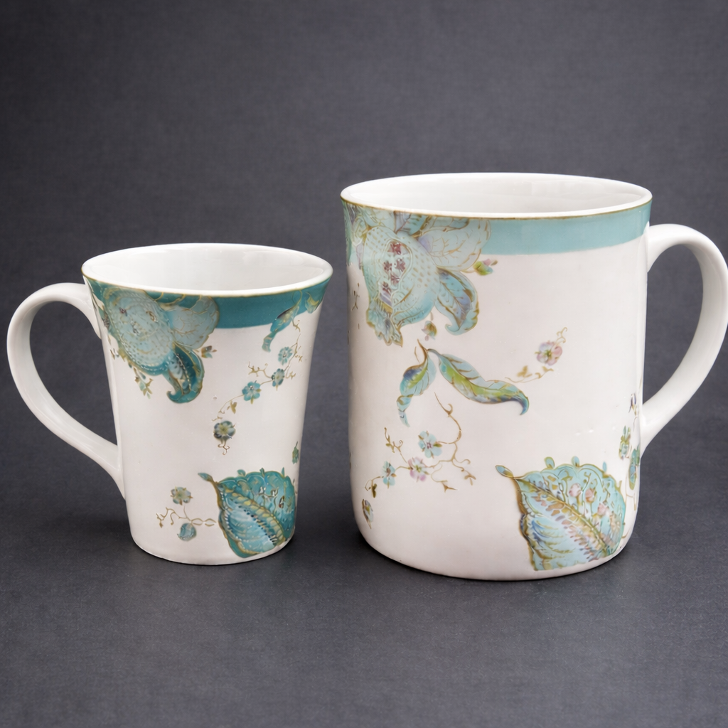 Set of 2 Floral Ceramic Coffee Mugs Blue Paisley Large & Small