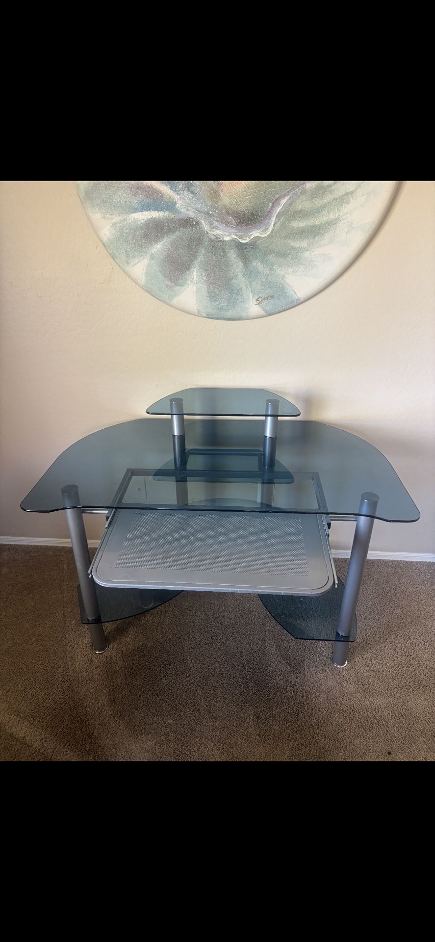 Sleek glass computer desk. Has tinted glass surfaces and silver metal legs. Main desk surface, a raised shelf, and a pull-out keyboard tray. Good for a home office setup or gaming. Sturdy build. No longer have a need for the desk as I am moving.