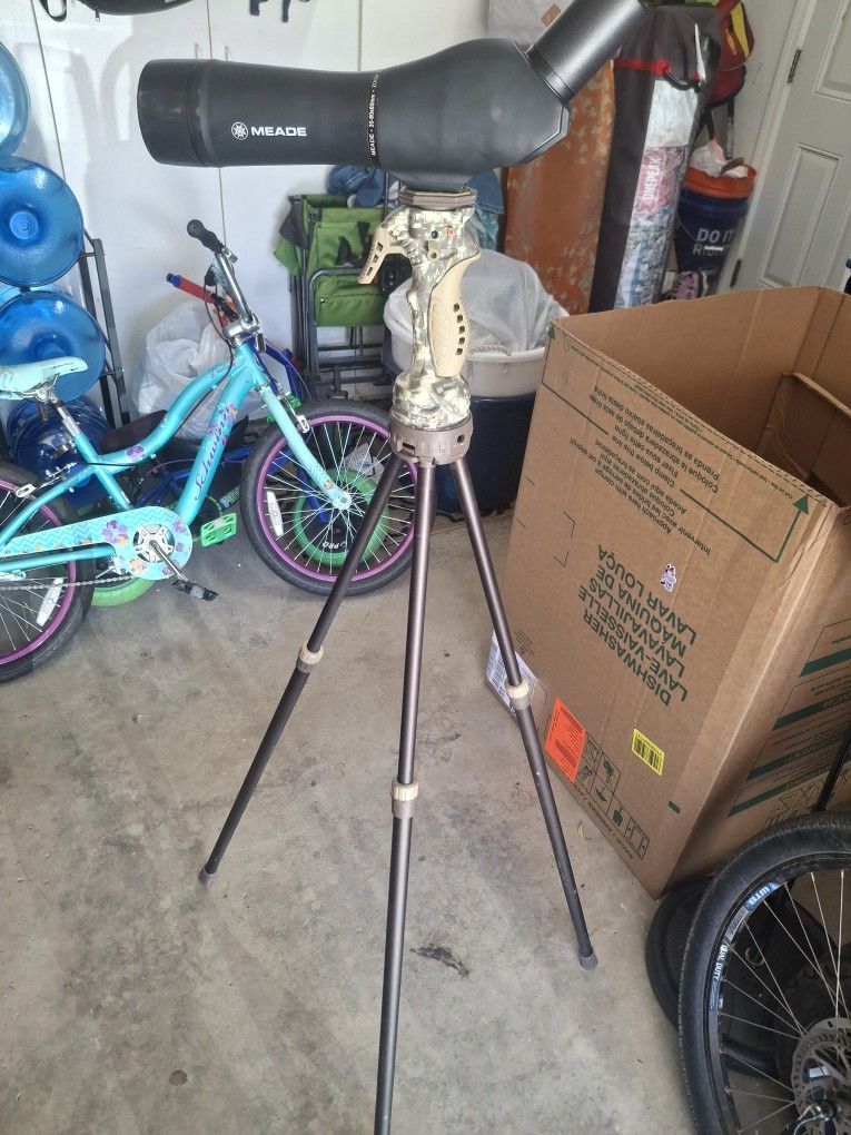 Scope and fully ajusting stand , pull the trigger and the legs drop into position and lock very cool for sighting in guns or glassing . Cash meet up only