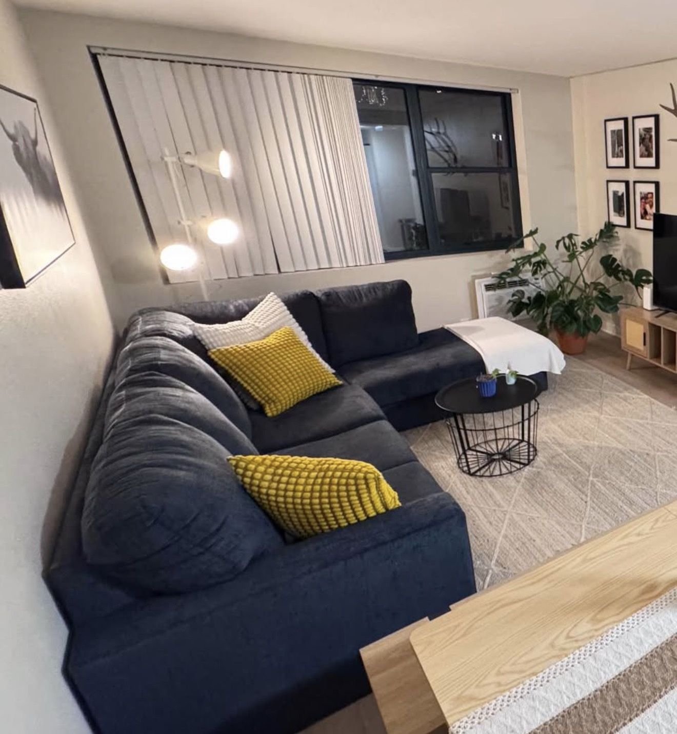 Beautiful dark blue 2-piece sectional sofa with chaise in excellent condition. Clean, comfortable, and very well maintained. Comes with decorative throw pillows (mustard yellow and off-white) included. Modern design that fits perfectly in living rooms or apartments. No stains, no damage, from a smoke-free home. Brand: Signature Design by Ashley Color: Dark blue Style: Sectional with chaise Condition: Excellent Size: approx. 86” W x 61” D Pickup only. Cash or Zelle accepted.