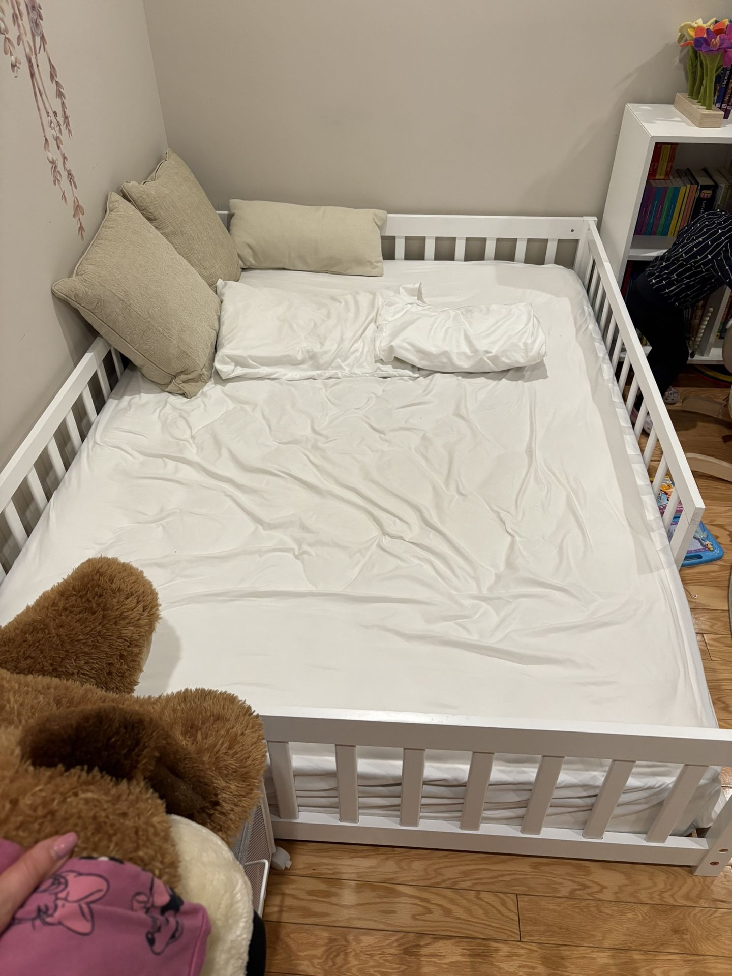 Floor bed with toddler safety rails. Mattress included. Only used less than 6 months for toddler. In great condition.