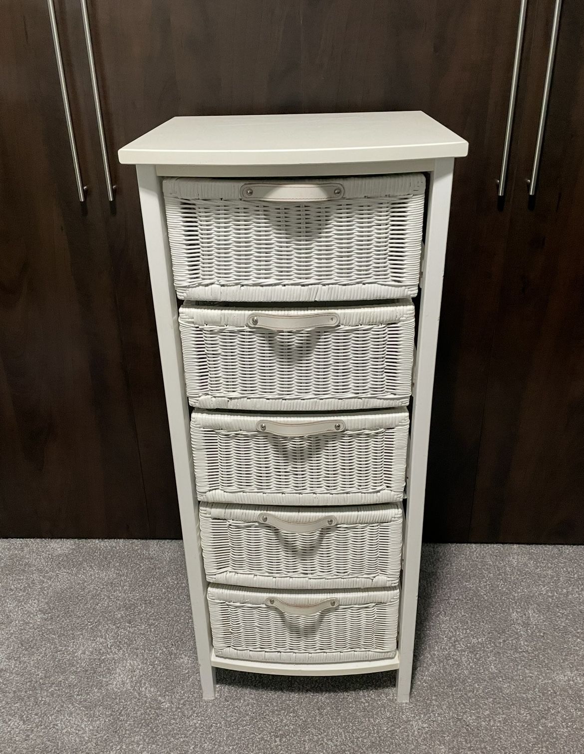 Tall White Wicker Dresser. Has 5 drawers. Please see photos for measurements and condition. Must pick up in Lake Stevens. $35 OBO