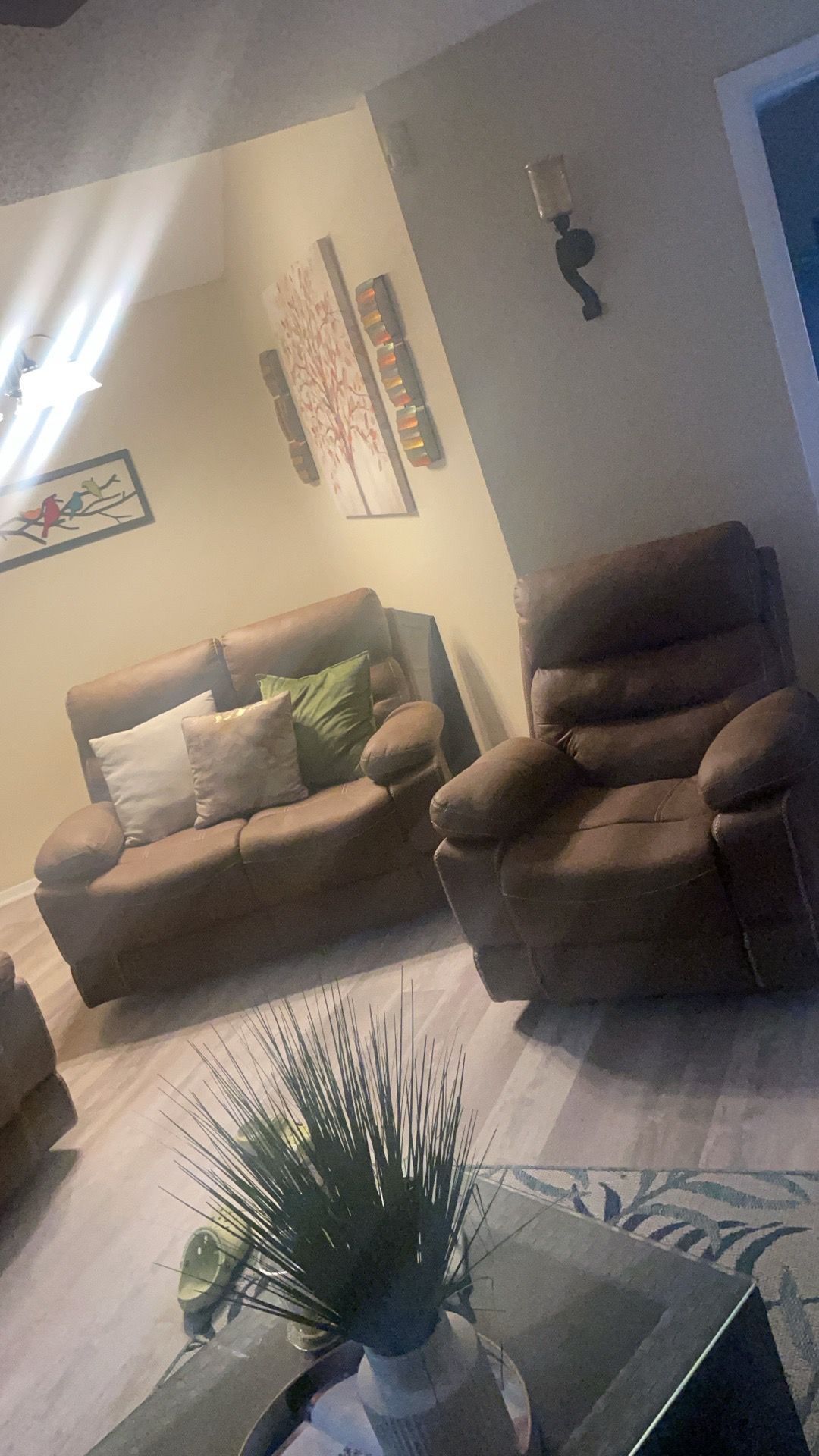 Beautiful brown reclining living room set in excellent condition. Includes: • Reclining sofa • Reclining loveseat • Reclining armchair This set is very comfortable, clean, and well-kept. The neutral brown color works perfectly with modern, cozy, or apartment-style decor. Recliners function smoothly and are great for relaxing, movie nights, or family living spaces. Ideal for: • Apartments or townhomes • First-time home setups • Living rooms needing a full matching set No rips, stains, or odors. Smoke-free home. Selling as a set. Pickup only. Serious inquiries only.