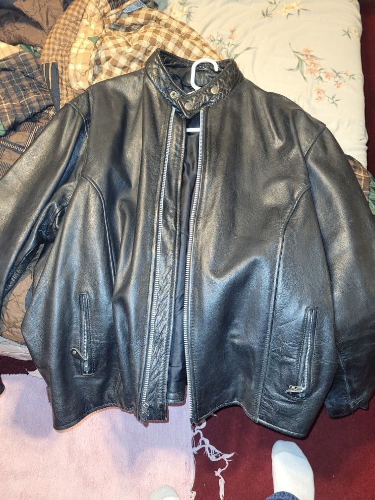 This is a very thick, all black leather riding jacket. The size says 54. I wear an xl and it fits me great. It was given to me, but I do not ride a motorcycle.